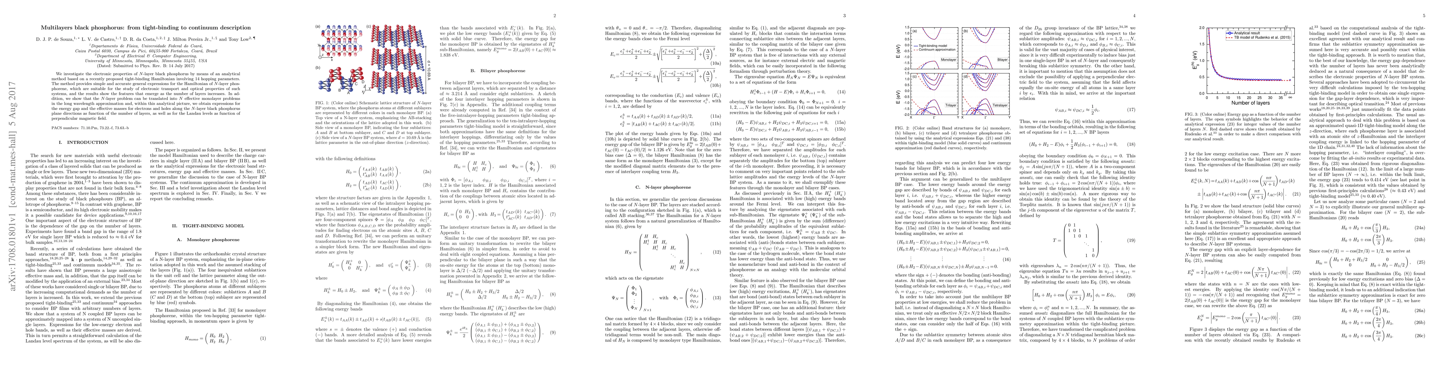 This paper develops an analytical tight-binding model for $N$-layer black phosphorus, providing expressions for electronic transport and optical properties. It reveals how electronic features, such as energy gaps and effective masses, evolve with increasing layers, and translates the multilayer problem into $N$ effective monolayer problems.
