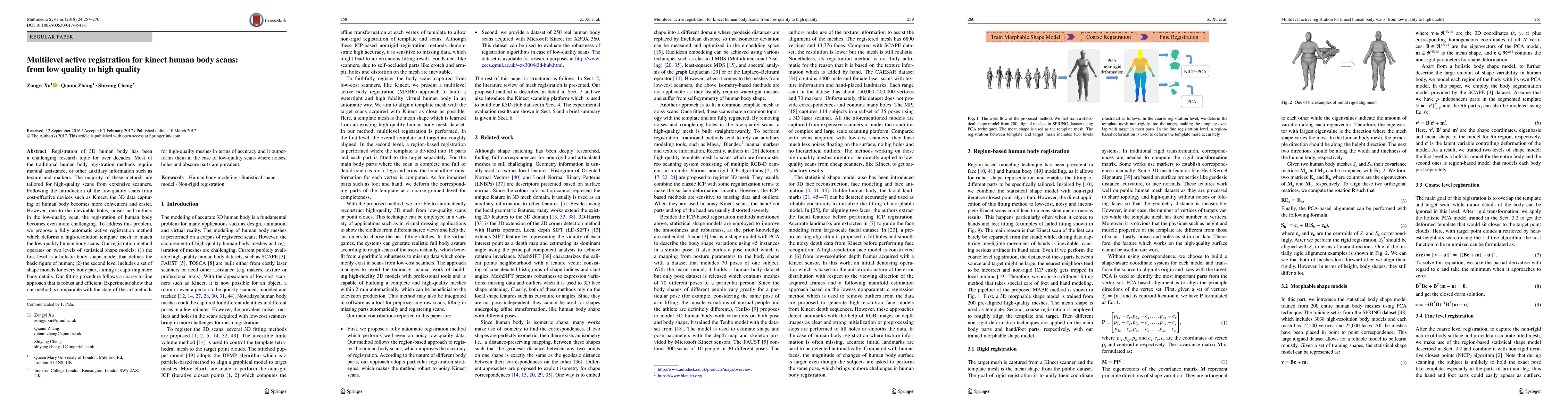 Registration of 3D human body has been a challenging research topic for over decades. Most of the traditional human body registration methods require manual assistance, or other auxiliary information such as texture and markers. The majority of these methods are tailored for high-quality scans from expensive scanners. Following the introduction of the low-quality scans from cost-effective devices such as Kinect, the 3D data capturing of human body becomes more convenient and easier. However, due to the inevitable holes, noises and outliers in the low-quality scan, the registration of human body becomes even more challenging. To address this problem, we propose a fully automatic active registration method which deforms a high-resolution template mesh to match the low-quality human body scans. Our registration method operates on two levels of statistical shape models: (1) the first level is a holistic body shape model that defines the basic figure of human; (2) the second level includes a set of shape models for every body part, aiming at capturing more body details. Our fitting procedure follows a coarse-to-fine approach that is robust and efficient. Experiments show that our method is comparable with the state-of-the-art methods.