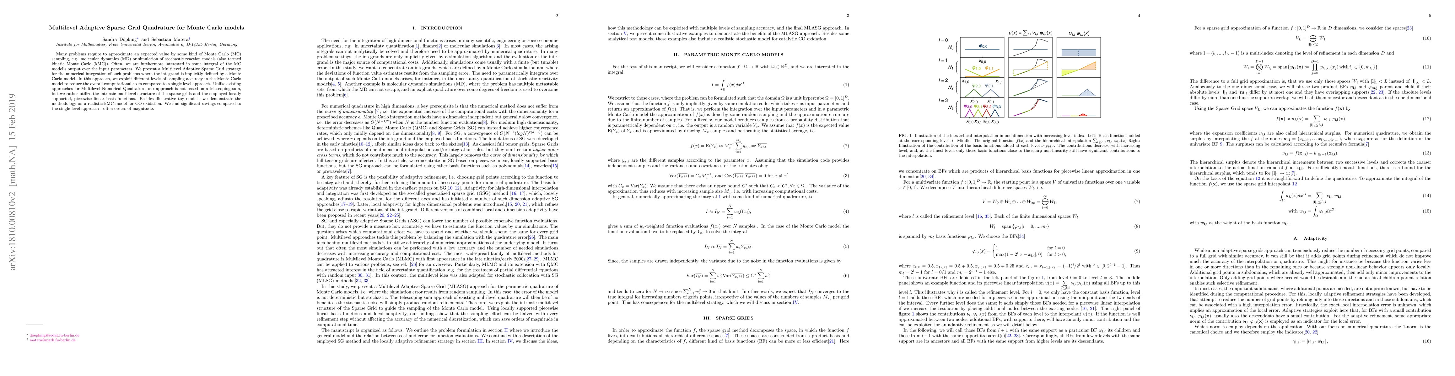 Many problems require to approximate an expected value by some kind of Monte Carlo (MC) sampling, e.g. molecular dynamics (MD) or simulation of stochastic reaction models (also termed kinetic Monte Carlo (kMC)). Often, we are furthermore interested in some integral of the MC model's output over the input parameters. We present a Multilevel Adaptive Sparse Grid strategy for the numerical integration of such problems where the integrand is implicitly defined by a Monte Carlo model. In this approach, we exploit different levels of sampling accuracy in the Monte Carlo model to reduce the overall computational costs compared to a single level approach. Unlike existing approaches for Multilevel Numerical Quadrature, our approach is not based on a telescoping sum, but we rather utilize the intrinsic multilevel structure of the sparse grids and the employed locally supported, piecewise linear basis functions. Besides illustrative toy models, we demonstrate the methodology on a realistic kMC model for CO oxidation. We find significant savings compared to the single level approach - often orders of magnitude.