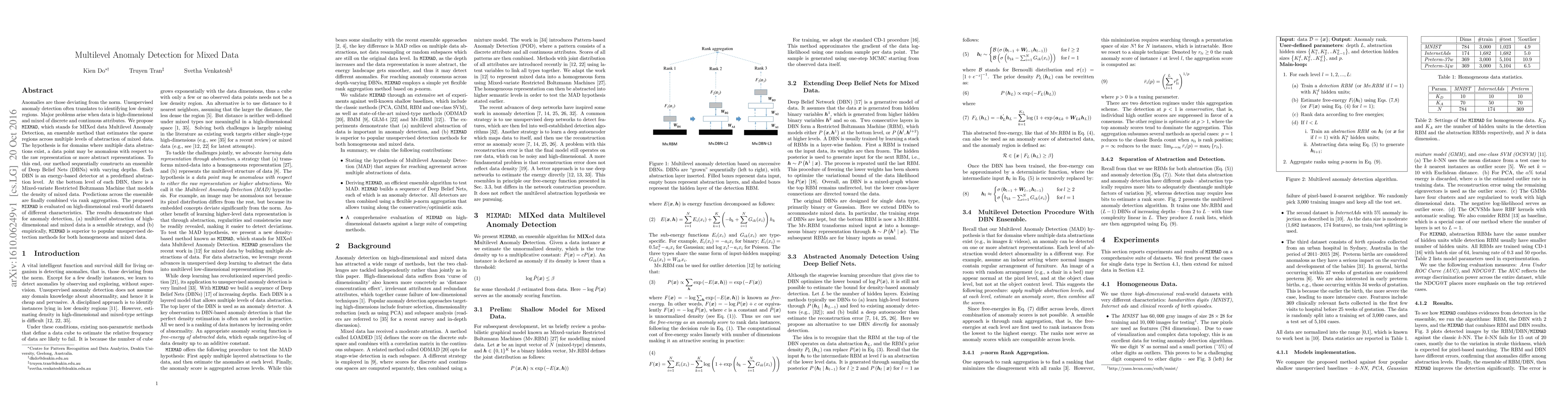 The MIXMAD method proposes an ensemble of Deep Belief Nets to detect anomalies in high-dimensional mixed data by modeling sparse regions at multiple levels of abstraction. Evaluations show that MIXMAD outperforms existing methods, highlighting the effectiveness of multilevel abstraction for anomaly detection.