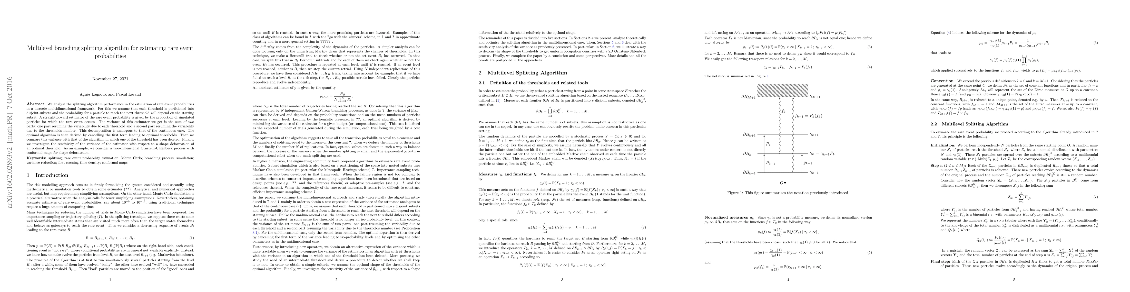 This paper evaluates the performance of a multilevel branching splitting algorithm for estimating rare event probabilities in a discrete multidimensional framework. The authors derive an optimal algorithm by minimizing the variance of the estimator, which is decomposed into variability components due to thresholds and their number, and compare it with a simplified version.