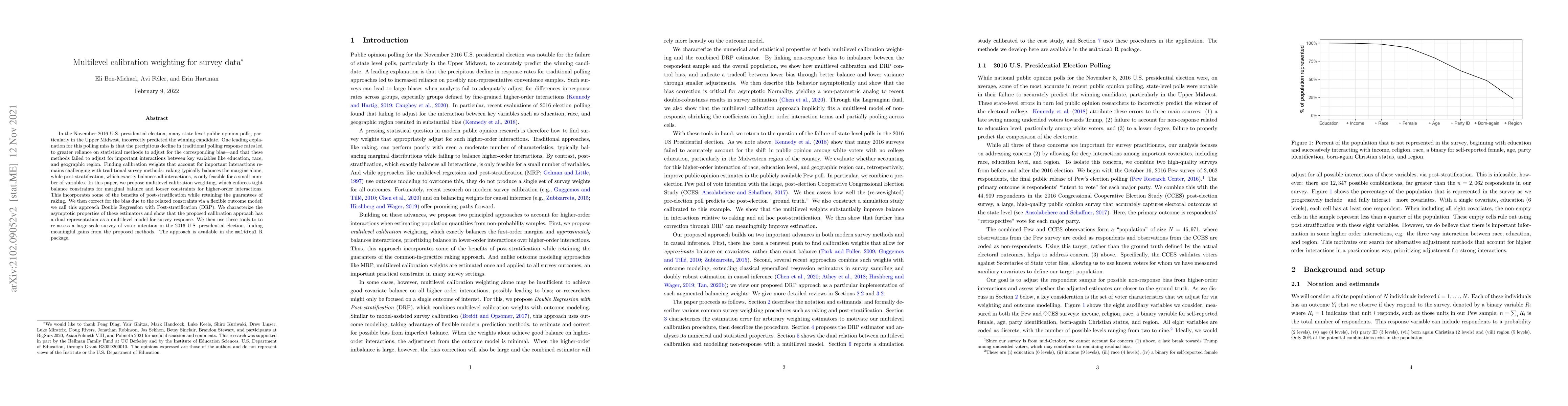 In the November 2016 U.S. presidential election, many state level public opinion polls, particularly in the Upper Midwest, incorrectly predicted the winning candidate. One leading explanation for this polling miss is that the precipitous decline in traditional polling response rates led to greater reliance on statistical methods to adjust for the corresponding bias -- and that these methods failed to adjust for important interactions between key variables like education, race, and geographic region. Finding calibration weights that account for important interactions remains challenging with traditional survey methods: raking typically balances the margins alone, while post-stratification, which exactly balances all interactions, is only feasible for a small number of variables. In this paper, we propose multilevel calibration weighting, which enforces tight balance constraints for marginal balance and looser constraints for higher-order interactions. This incorporates some of the benefits of post-stratification while retaining the guarantees of raking. We then correct for the bias due to the relaxed constraints via a flexible outcome model; we call this approach Double Regression with Post-stratification (DRP). We characterize the asymptotic properties of these estimators and show that the proposed calibration approach has a dual representation as a multilevel model for survey response. We then use these tools to to re-assess a large-scale survey of voter intention in the 2016 U.S. presidential election, finding meaningful gains from the proposed methods. The approach is available in the multical R package.