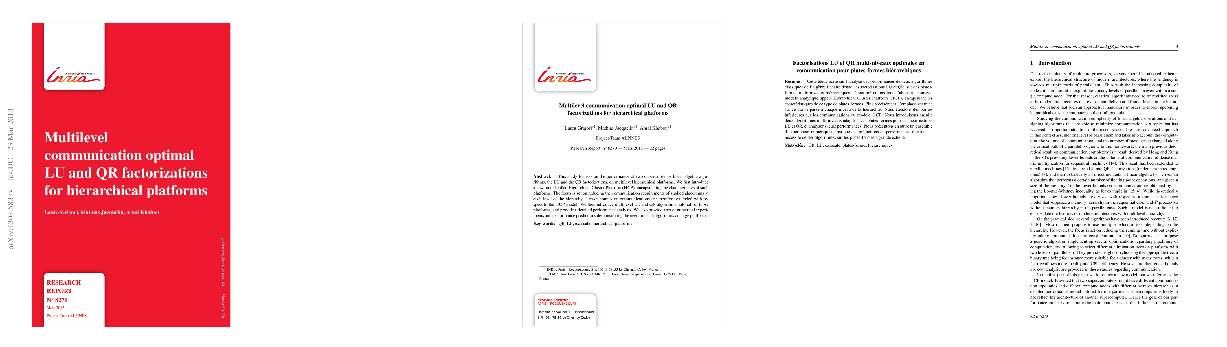 This paper introduces multilevel LU and QR factorization algorithms optimized for hierarchical cluster platforms, aiming to minimize communication overhead. It presents a new Hierarchical Cluster Platform model and provides performance analysis and numerical experiments to demonstrate their effectiveness.