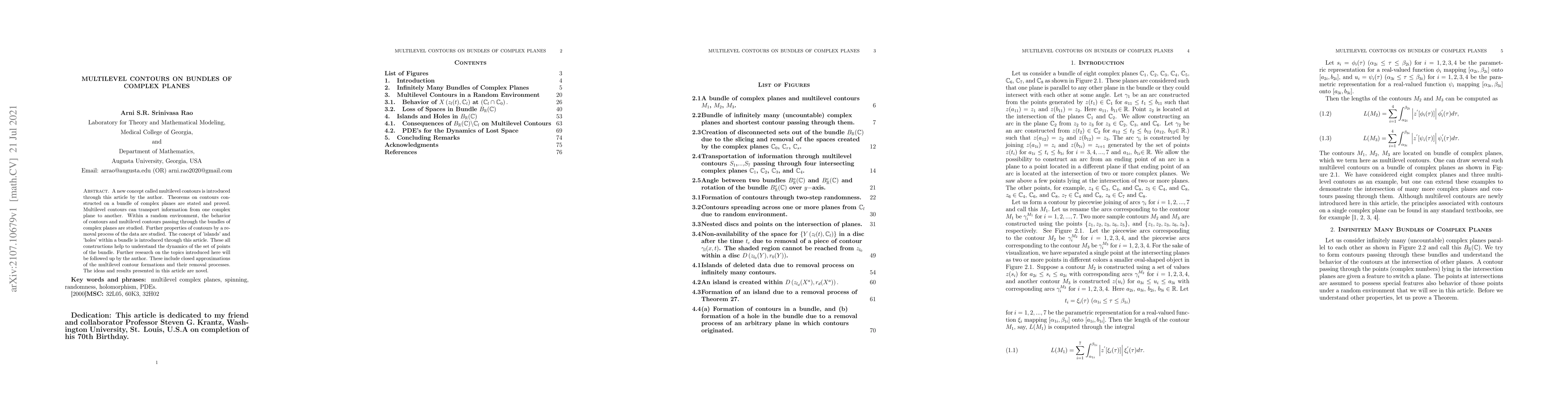 A new concept called multilevel contours is introduced through this article by the author. Theorems on contours constructed on a bundle of complex planes are stated and proved. Multilevel contours can transport information from one complex plane to another. Within a random environment, the behavior of contours and multilevel contours passing through the bundles of complex planes are studied. Further properties of contours by a removal process of the data are studied. The concept of 'islands' and 'holes' within a bundle is introduced through this article. These all constructions help to understand the dynamics of the set of points of the bundle. Further research on the topics introduced here will be followed up by the author. These include closed approximations of the multilevel contour formations and their removal processes. The ideas and results presented in this article are novel.