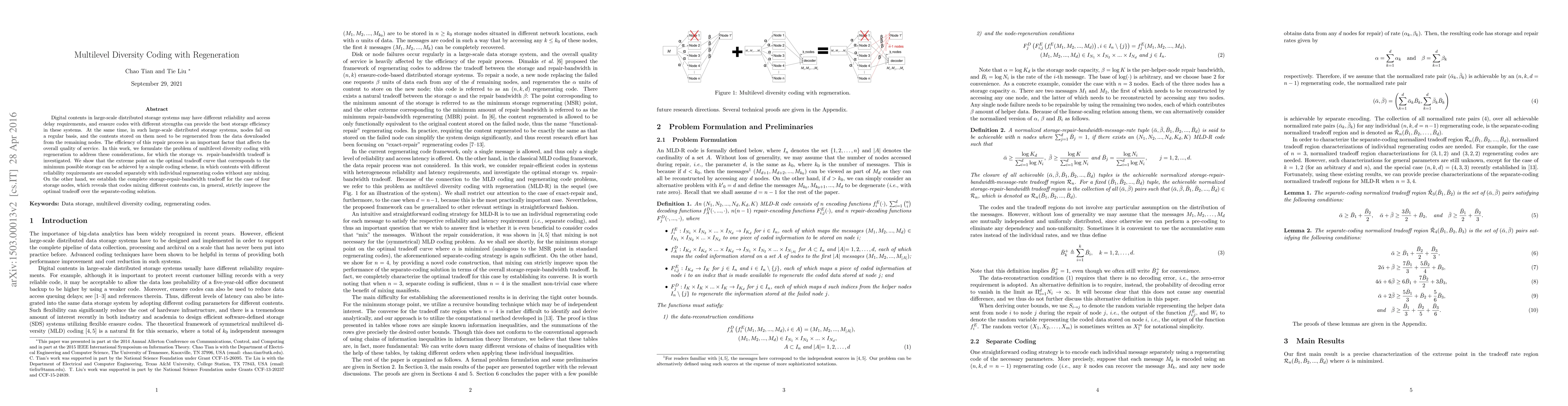 Digital contents in large scale distributed storage systems may have different reliability and access delay requirements, and for this reason, erasure codes with different strengths need to be utilized to achieve the best storage efficiency. At the same time, in such large scale distributed storage systems, nodes fail on a regular basis, and the contents stored on them need to be regenerated and stored on other healthy nodes, the efficiency of which is an important factor affecting the overall quality of service. In this work, we formulate the problem of multilevel diversity coding with regeneration to address these considerations, for which the storage vs. repair-bandwidth tradeoff is investigated. We show that the extreme point on this tradeoff corresponding to the minimum possible storage can be achieved by a simple coding scheme, where contents with different reliability requirements are encoded separately with individual regenerating codes without any mixing. On the other hand, we establish the complete storage-repair-bandwidth tradeoff for the case of four storage nodes, which reveals that codes mixing different contents can strictly improve this tradeoff over the separate coding solution.