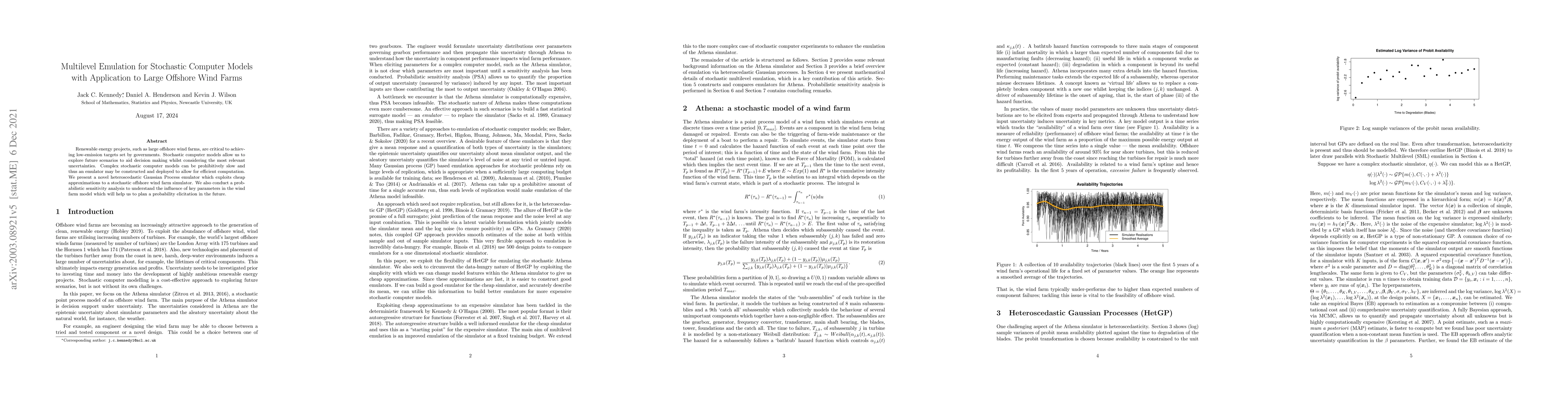 Renewable energy projects, such as large offshore wind farms, are critical to achieving low-emission targets set by governments. Stochastic computer models allow us to explore future scenarios to aid decision making whilst considering the most relevant uncertainties. Complex stochastic computer models can be prohibitively slow and thus an emulator may be constructed and deployed to allow for efficient computation. We present a novel heteroscedastic Gaussian Process emulator which exploits cheap approximations to a stochastic offshore wind farm simulator. We also conduct a probabilistic sensitivity analysis to understand the influence of key parameters in the wind farm model which will help us to plan a probability elicitation in the future.