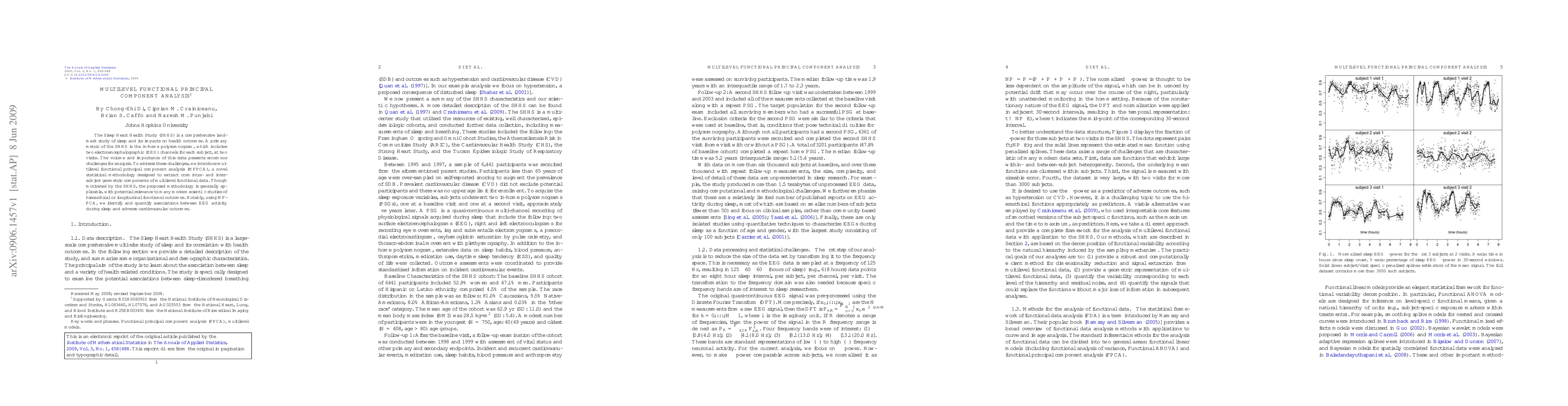 This paper introduces multilevel functional principal component analysis (MFPCA) to analyze complex, hierarchical sleep data from the Sleep Heart Health Study (SHHS). The methodology extracts key components from EEG data and identifies associations between sleep EEG activity and cardiovascular health outcomes.