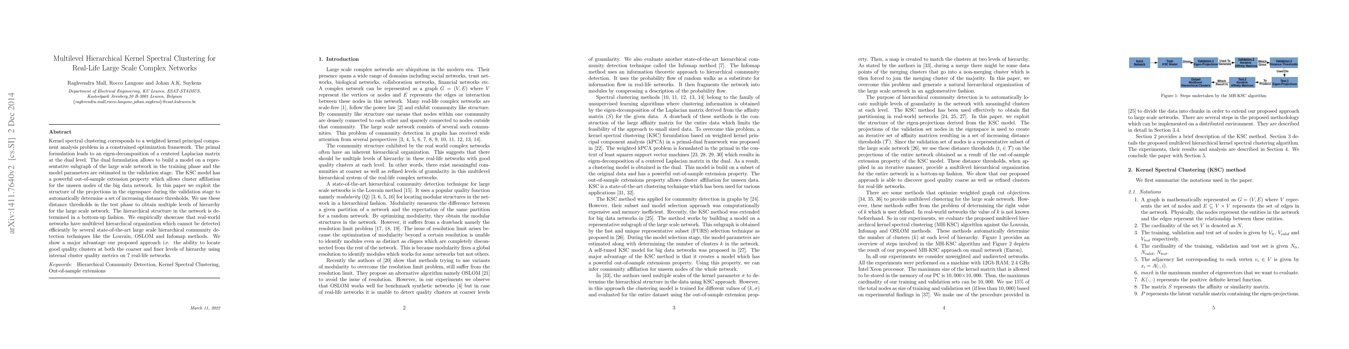 This paper proposes a multilevel hierarchical kernel spectral clustering method for large-scale complex networks, demonstrating its effectiveness in identifying multilevel hierarchies in real-world networks that are not efficiently detected by existing methods. The approach uses distance thresholds determined during validation to achieve high-quality clustering at both coarse and fine levels.