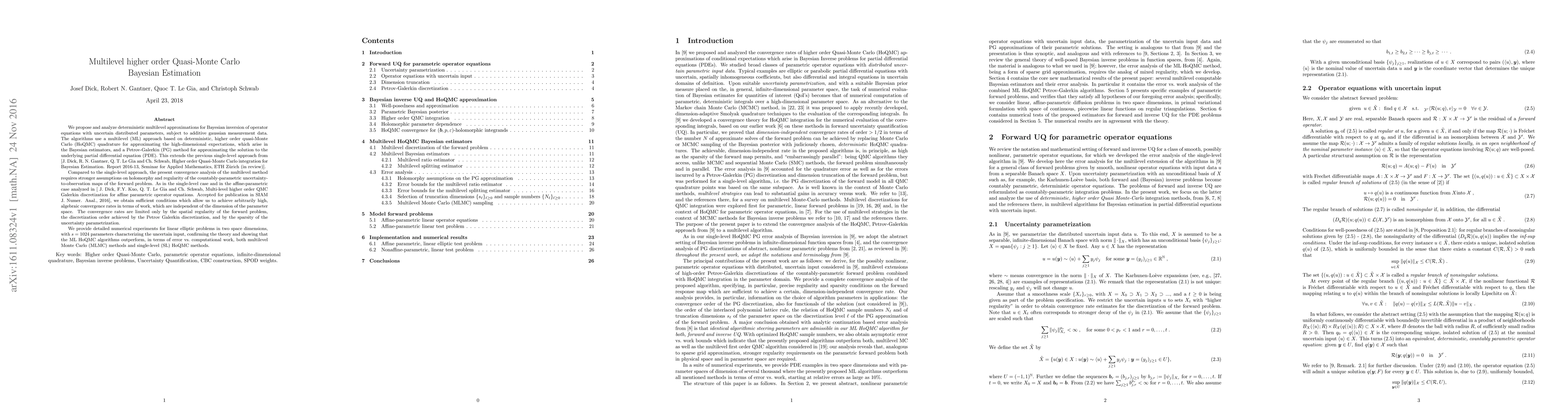 This paper proposes multilevel higher order quasi-Monte Carlo Bayesian estimation methods for solving operator equations with uncertain parameters and Gaussian measurement noise. The approach combines deterministic multilevel approximations and quasi-Monte Carlo quadrature for high-dimensional integrals, achieving high algebraic convergence rates independent of parameter space dimension. Numerical experiments demonstrate superior performance over multilevel Monte Carlo and single-level quasi-Monte Carlo methods.