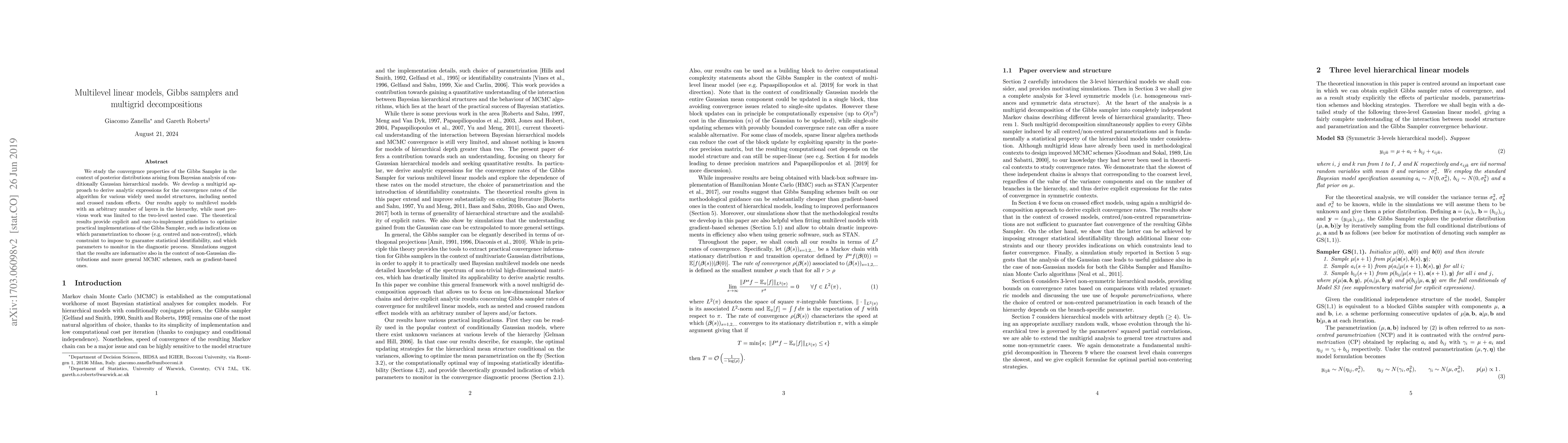 This research offers valuable insights into the interaction between multilevel structures and the Gibbs Sampler, providing guidance for choosing computationally optimal parametrizations and identifying parameters to monitor in convergence diagnostics, which is relevant beyond the Gaussian case.