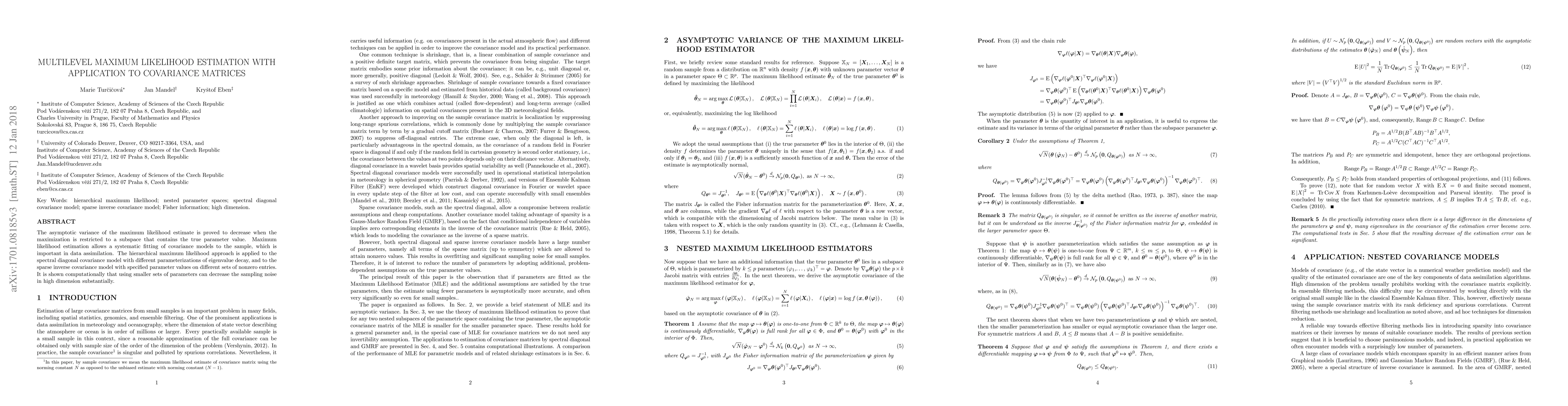 The asymptotic variance of the maximum likelihood estimate is proved to decrease when the maximization is restricted to a subspace that contains the true parameter value. Maximum likelihood estimation allows a systematic fitting of covariance models to the sample, which is important in data assimilation. The hierarchical maximum likelihood approach is applied to the spectral diagonal covariance model with different parameterizations of eigenvalue decay, and to the sparse inverse covariance model with specified parameter values on different sets of nonzero entries. It is shown computationally that using smaller sets of parameters can decrease the sampling noise in high dimension substantially.