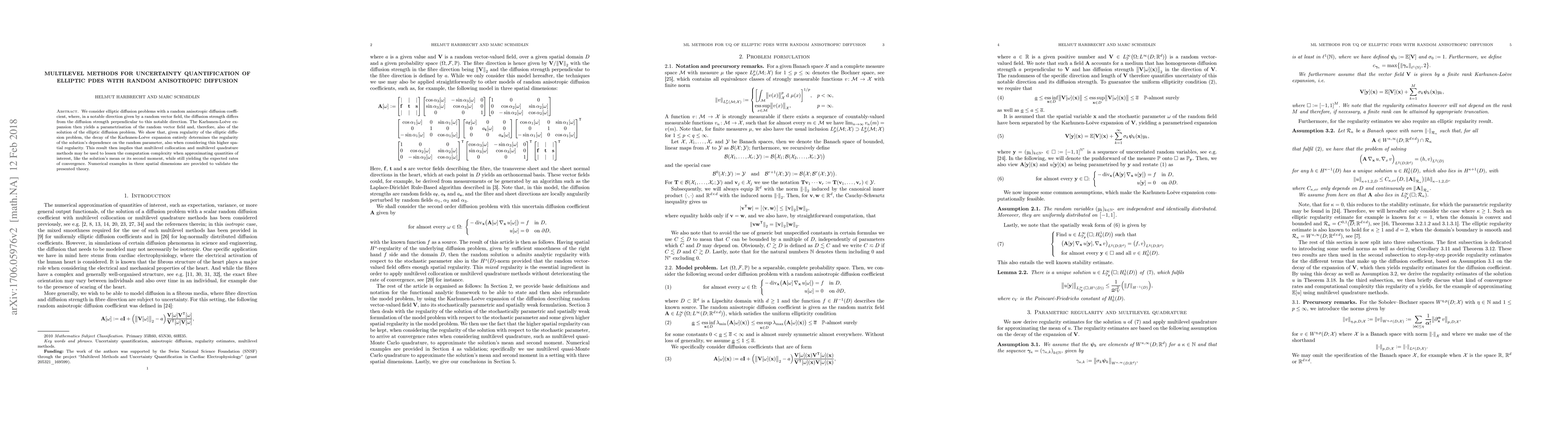 This research paper develops multilevel methods for approximating solutions to elliptic PDEs with random anisotropic diffusion coefficients, showing that the decay of Karhunen-Loeve expansion determines solution regularity.