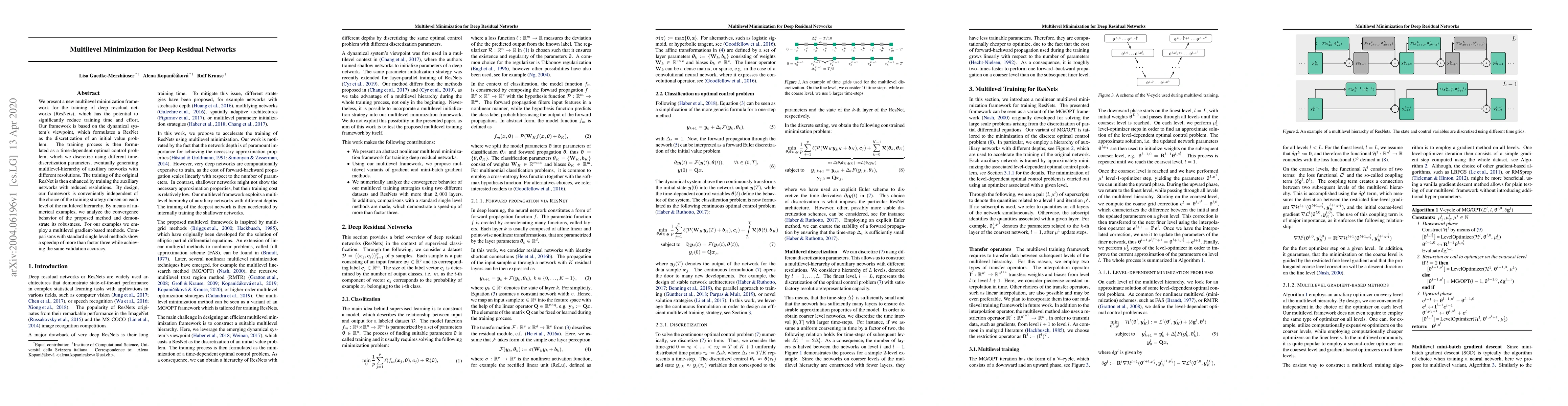 A new training framework for deep residual networks reduces training time and effort by using a multilevel minimization approach, achieving speedups of over three times while maintaining validation accuracy.