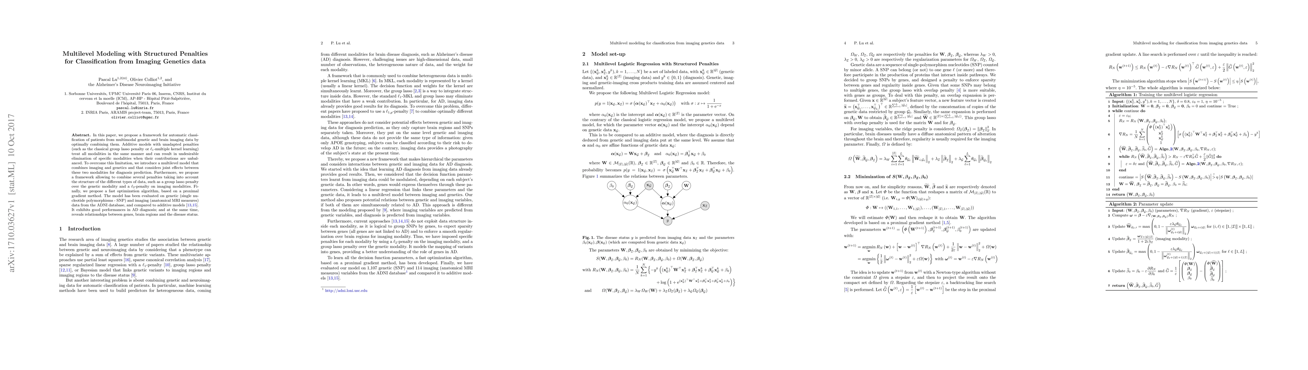 In this paper, we propose a framework for automatic classification of patients from multimodal genetic and brain imaging data by optimally combining them. Additive models with unadapted penalties (such as the classical group lasso penalty or $L_1$-multiple kernel learning) treat all modalities in the same manner and can result in undesirable elimination of specific modalities when their contributions are unbalanced. To overcome this limitation, we introduce a multilevel model that combines imaging and genetics and that considers joint effects between these two modalities for diagnosis prediction. Furthermore, we propose a framework allowing to combine several penalties taking into account the structure of the different types of data, such as a group lasso penalty over the genetic modality and a $L_2$-penalty on imaging modalities. Finally , we propose a fast optimization algorithm, based on a proximal gradient method. The model has been evaluated on genetic (single nucleotide polymorphisms-SNP) and imaging (anatomical MRI measures) data from the ADNI database, and compared to additive models. It exhibits good performances in AD diagnosis; and at the same time, reveals relationships between genes, brain regions and the disease status.