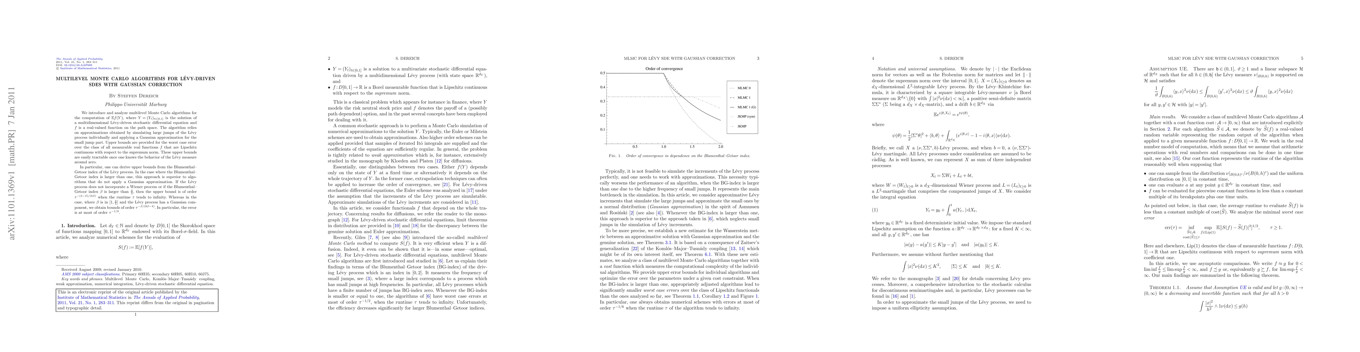 We introduce and analyze multilevel Monte Carlo algorithms for the computation of $\mathbb {E}f(Y)$, where $Y=(Y_t)_{t\in[0,1]}$ is the solution of a multidimensional L\'{e}vy-driven stochastic differential equation and $f$ is a real-valued function on the path space. The algorithm relies on approximations obtained by simulating large jumps of the L\'{e}vy process individually and applying a Gaussian approximation for the small jump part. Upper bounds are provided for the worst case error over the class of all measurable real functions $f$ that are Lipschitz continuous with respect to the supremum norm. These upper bounds are easily tractable once one knows the behavior of the L\'{e}vy measure around zero. In particular, one can derive upper bounds from the Blumenthal--Getoor index of the L\'{e}vy process. In the case where the Blumenthal--Getoor index is larger than one, this approach is superior to algorithms that do not apply a Gaussian approximation. If the L\'{e}vy process does not incorporate a Wiener process or if the Blumenthal--Getoor index $\beta$ is larger than $\frac{4}{3}$, then the upper bound is of order $\tau^{-({4-\beta})/({6\beta})}$ when the runtime $\tau$ tends to infinity. Whereas in the case, where $\beta$ is in $[1,\frac{4}{3}]$ and the L\'{e}vy process has a Gaussian component, we obtain bounds of order $\tau^{-\beta/(6\beta-4)}$. In particular, the error is at most of order $\tau^{-1/6}$.
