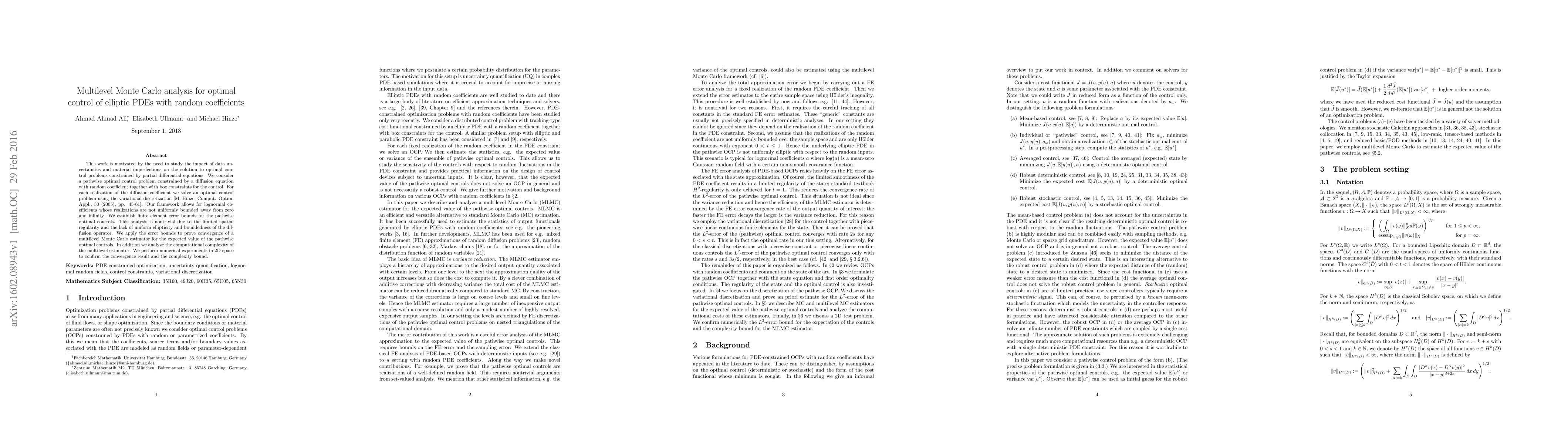 This paper develops a multilevel Monte Carlo analysis for optimal control of elliptic PDEs with random coefficients, establishing finite element error bounds and proving convergence of a multilevel estimator for expected values of pathwise optimal controls. Numerical experiments in 2D confirm the theoretical convergence and complexity bounds.