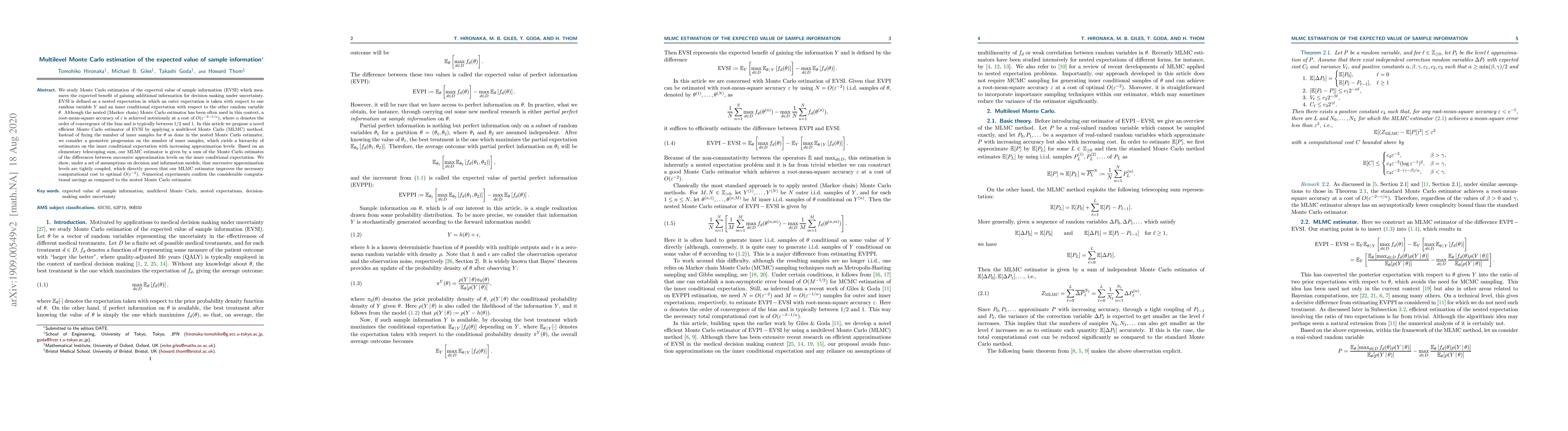 This paper proposes a novel multilevel Monte Carlo (MLMC) estimator for calculating the expected value of sample information (EVSI), which measures the benefit of acquiring additional information for decision-making. Unlike traditional nested Monte Carlo methods, MLMC uses a geometric progression in the number of inner samples, leading to significant computational savings while maintaining accuracy, achieving optimal computational cost of $O(\varepsilon^{-2})$.