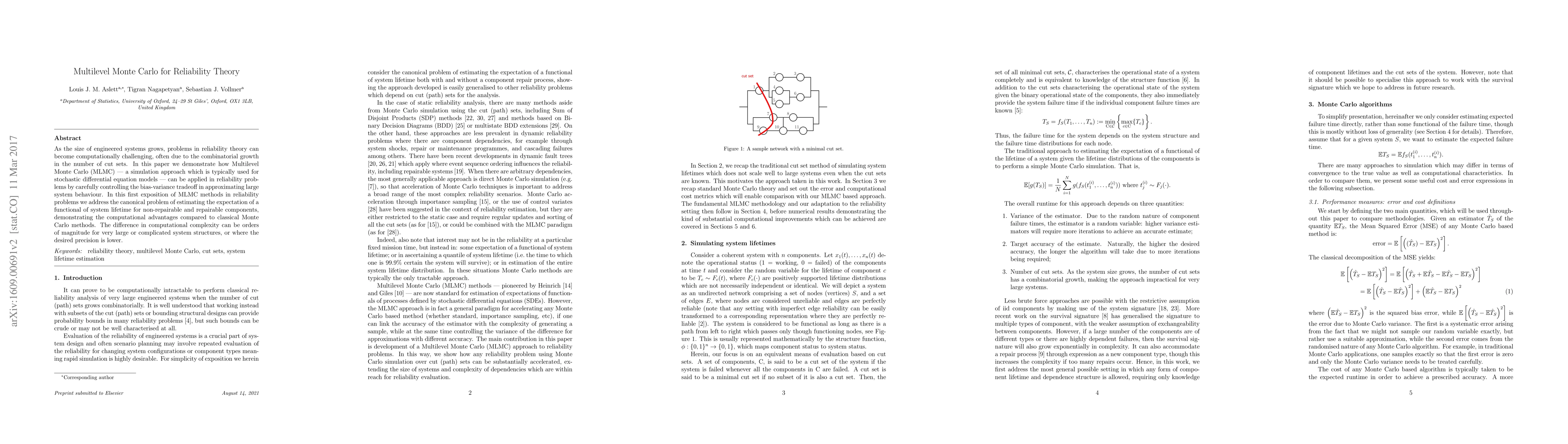 This paper introduces Multilevel Monte Carlo (MLMC) methods for solving reliability problems in large engineered systems, demonstrating significant computational advantages over classical Monte Carlo by managing the bias-variance tradeoff. The study focuses on estimating the expectation of a system's lifetime, showing MLMC can reduce complexity by orders of magnitude for complex systems.