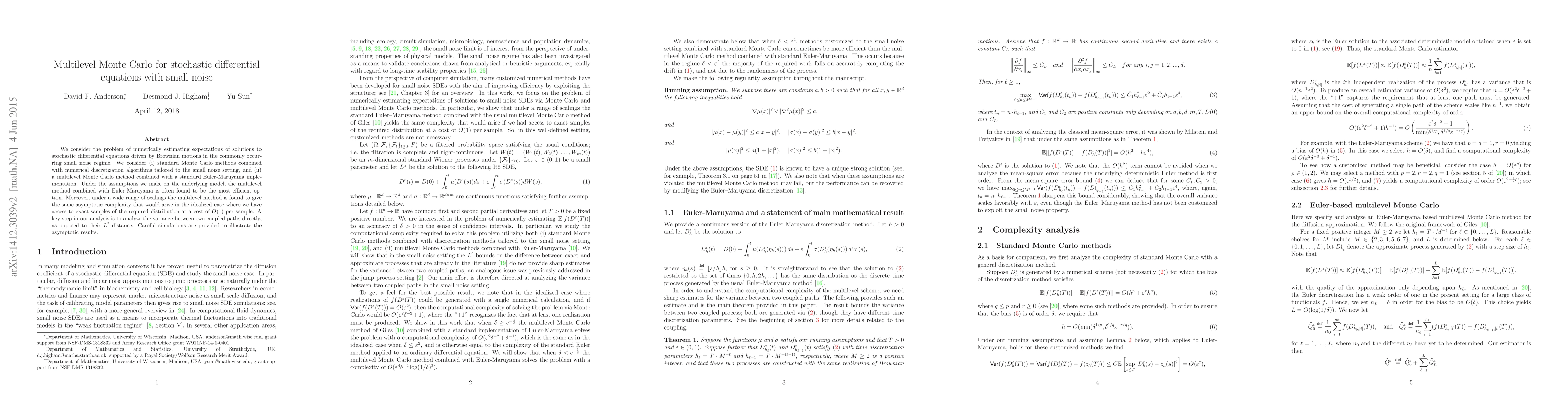 This paper evaluates numerical methods for estimating expectations in stochastic differential equations with small noise, comparing standard Monte Carlo with a tailored discretization and multilevel Monte Carlo with Euler-Maruyama. The multilevel approach is shown to be more efficient and achieves the same asymptotic complexity as methods with exact sample access.