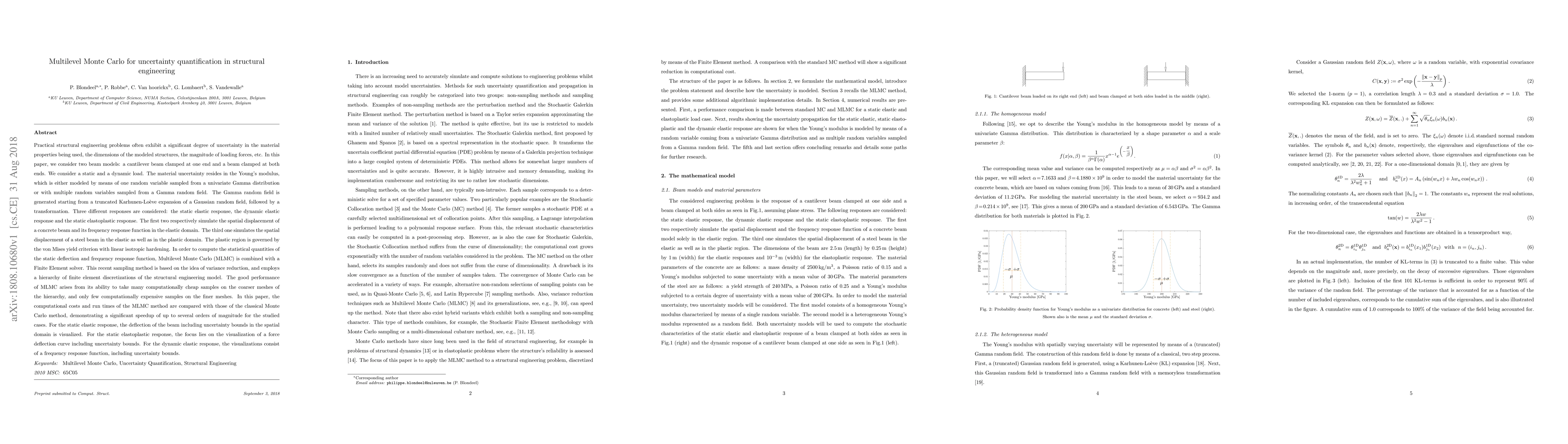 This paper investigates uncertainty quantification in structural engineering using Multilevel Monte Carlo (MLMC) for a cantilever beam and a beam clamped at both ends under static and dynamic loads. MLMC, combined with a Finite Element solver, significantly reduces computational costs compared to classical Monte Carlo, achieving speedups of several orders of magnitude.