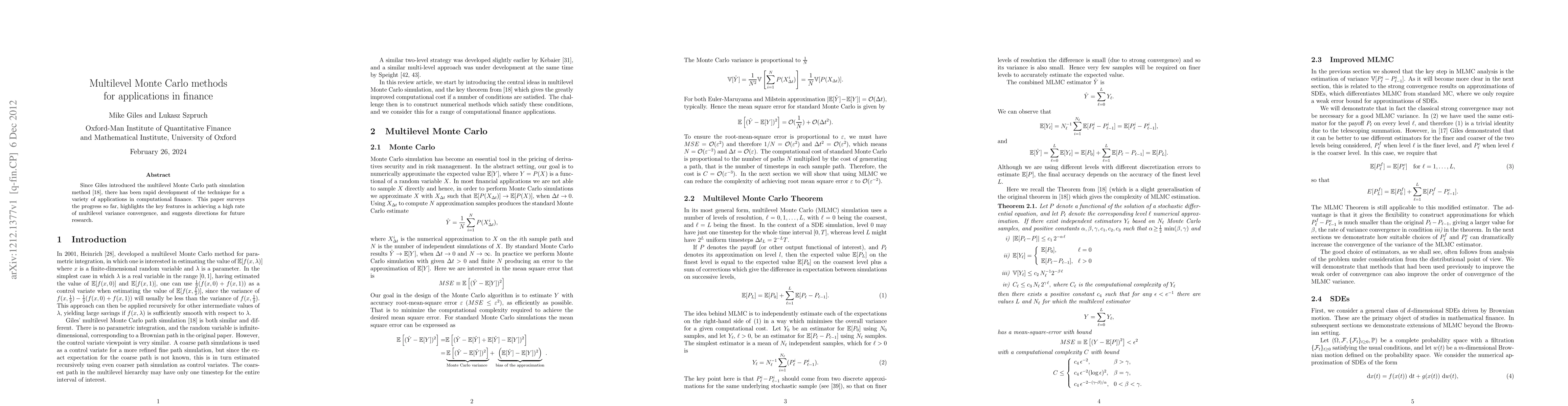 This paper reviews advancements in multilevel Monte Carlo methods, which enhance computational efficiency in financial simulations by achieving rapid variance convergence, and outlines potential future research avenues.