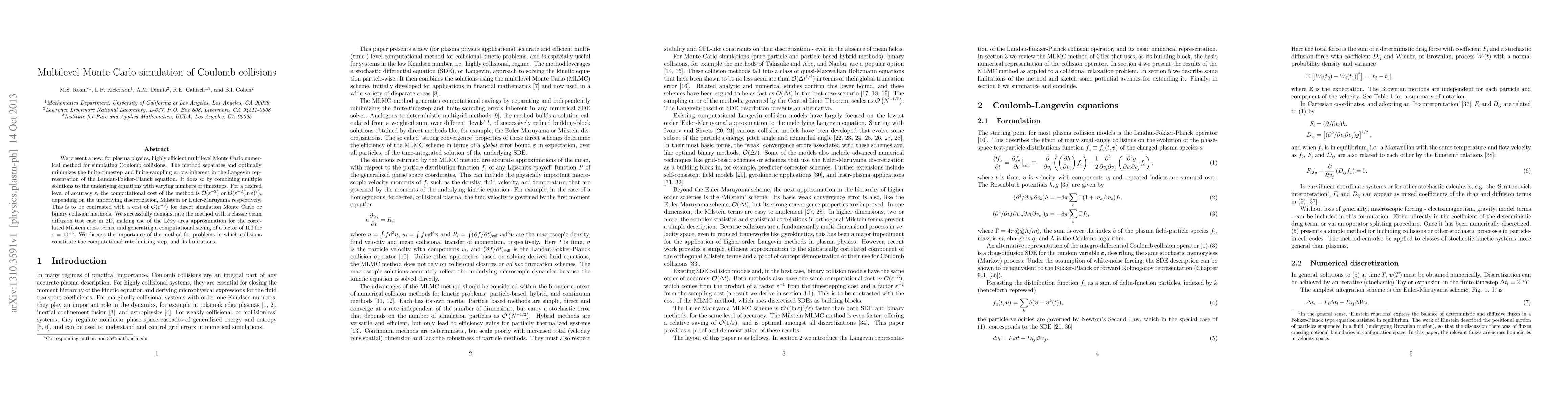 This research introduces a highly efficient multilevel Monte Carlo method for simulating Coulomb collisions in plasma physics, which optimally minimizes errors and achieves computational costs of order epsilon^{-2} or epsilon^{-2} (ln epsilon)^2, significantly reducing the cost compared to traditional methods. The method demonstrates a computational saving of a factor of 100 in a 2D beam diffusion test case.