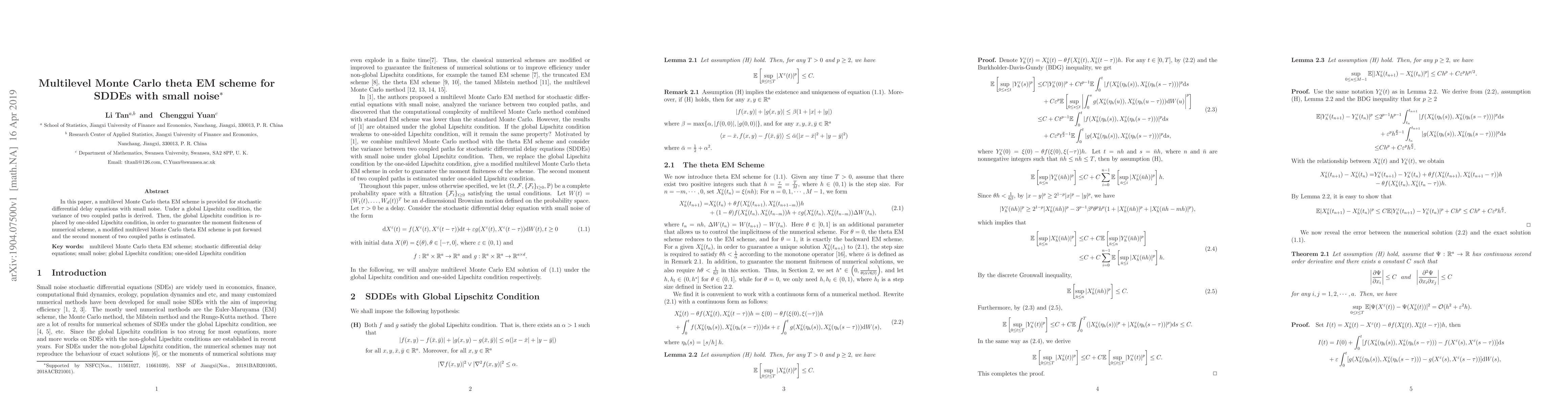 This paper introduces a multilevel Monte Carlo theta EM scheme for solving stochastic differential delay equations with small noise. It derives the variance of two coupled paths under a global Lipschitz condition, and then modifies the scheme to satisfy a one-sided Lipschitz condition to ensure the finiteness of the numerical scheme's moments.