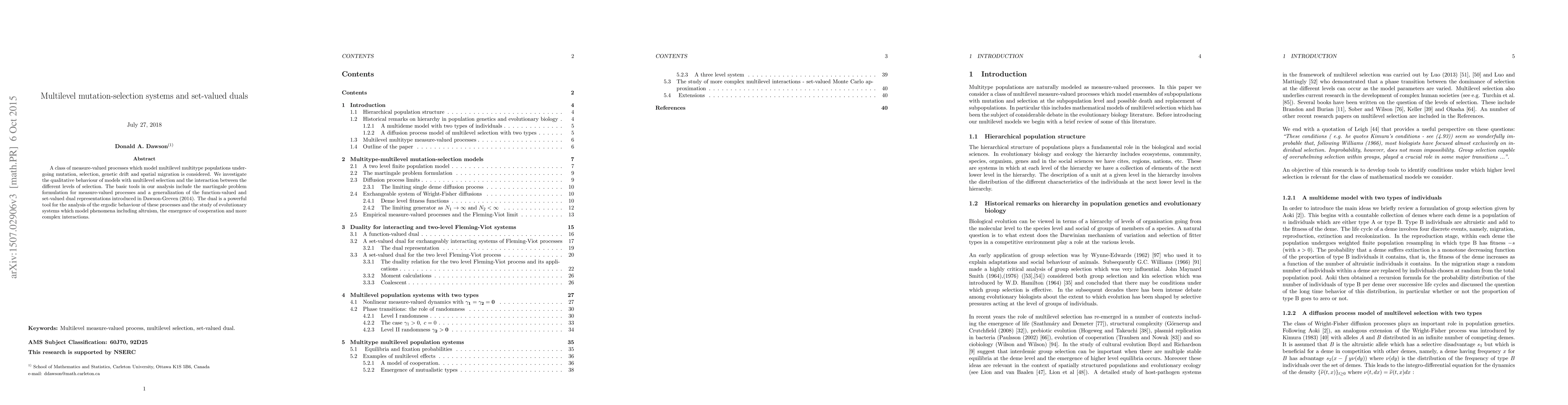 A class of measure-valued processes which model multilevel populations undergoing mutation, selection, genetic drift and spatial migration is considered. We investigate the qualitative behaviour of models with multilevel selection and the interaction between the different levels of selection. The basic tools in our analysis include the martingale problem formulation for measure-valued processes and a generalization of the set-valued dual representation introduced in Dawson-Greven (2014). In particular we describe the ergodic behaviour of these processes and review some situations under which deme level selection determines the long-time behaviour.