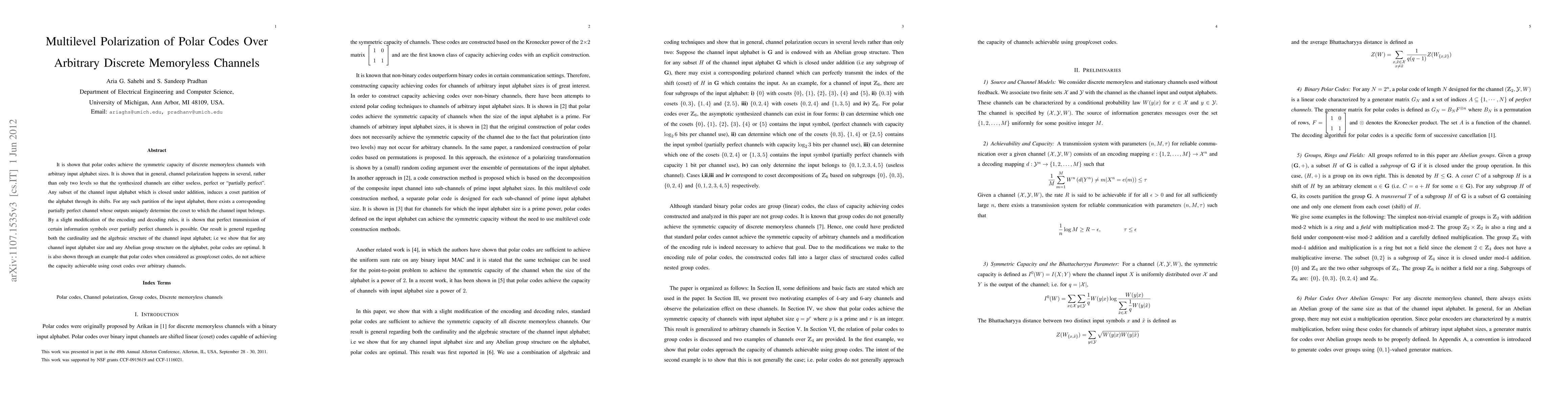 This paper demonstrates that polar codes can achieve the symmetric capacity of discrete memoryless channels with arbitrary input alphabet sizes, revealing that channel polarization occurs in multiple levels, resulting in synthesized channels that are either useless, perfect, or partially perfect. The study also shows that perfect transmission over partially perfect channels is feasible through modified encoding and decoding rules.