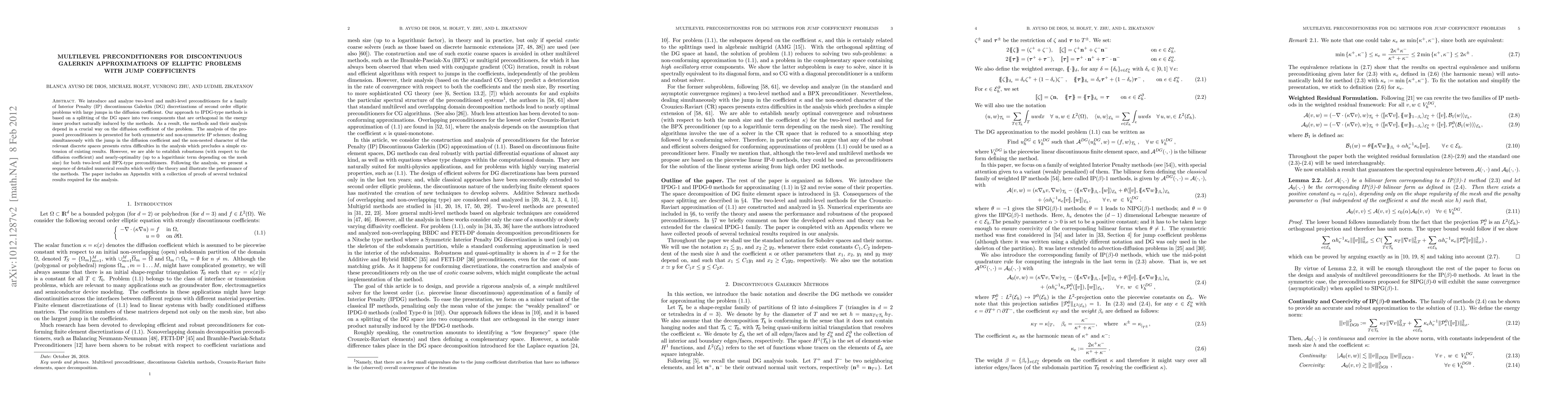 This paper introduces and analyzes two-level and multi-level preconditioners for Interior Penalty Discontinuous Galerkin methods applied to elliptic problems with significant diffusion coefficient variations. The proposed preconditioners are shown to be robust and nearly-optimal, with numerical results verifying the theoretical findings.
