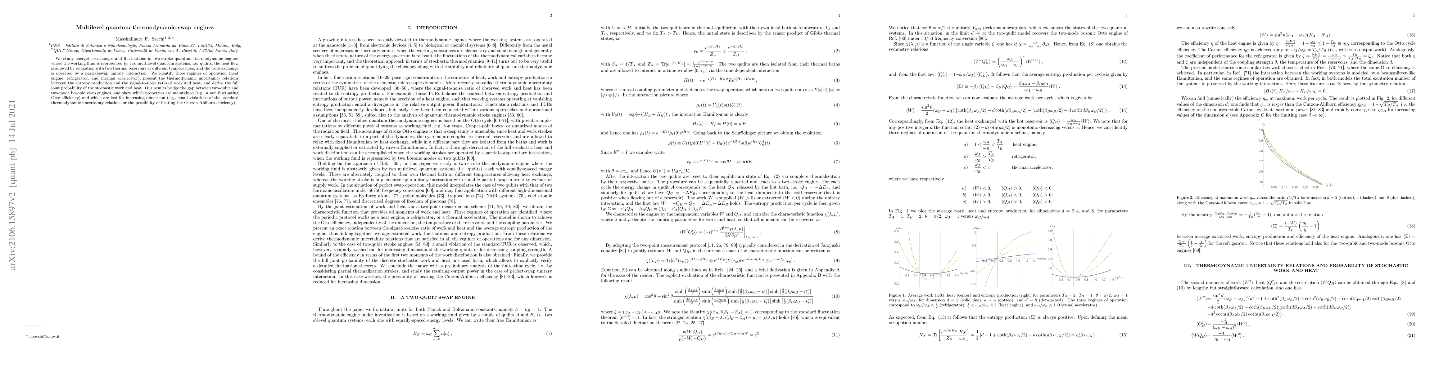 This paper investigates multilevel quantum thermodynamic swap engines using two-level quantum systems, identifying three operational regimes and analyzing thermodynamic uncertainty relations. It bridges the gap between two-qubit and bosonic swap engines, revealing properties preserved and lost with increasing system dimension.