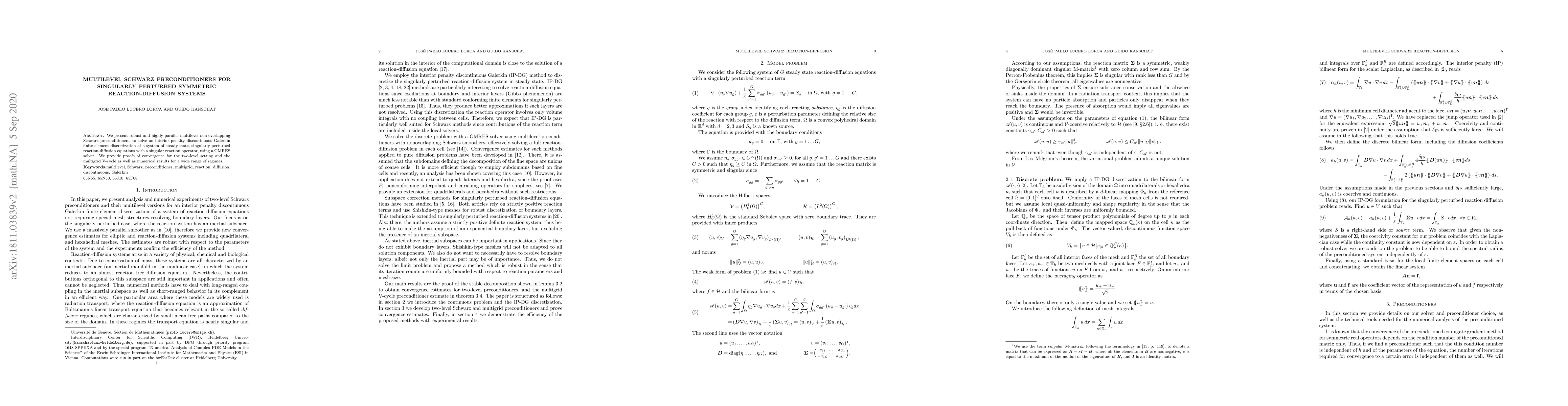 This paper introduces robust, parallel multilevel Schwarz preconditioners for solving discretized singularly perturbed reaction-diffusion systems using GMRES solvers. It provides convergence proofs for both two-level and multigrid V-cycle implementations, along with numerical results across various scenarios.