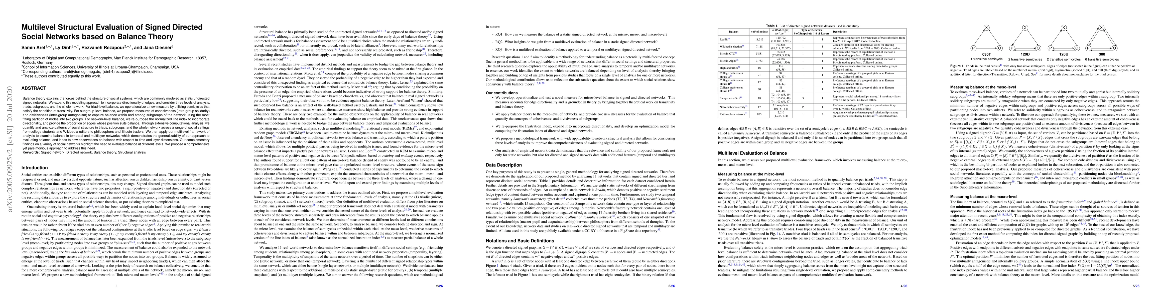 This paper develops a multilevel structural evaluation framework for signed directed social networks based on Balance Theory, introducing new measures for triad-level, subgroup-level, and network-level balance. The study applies this framework across diverse social networks to reveal patterns and the importance of evaluating balance at multiple levels.