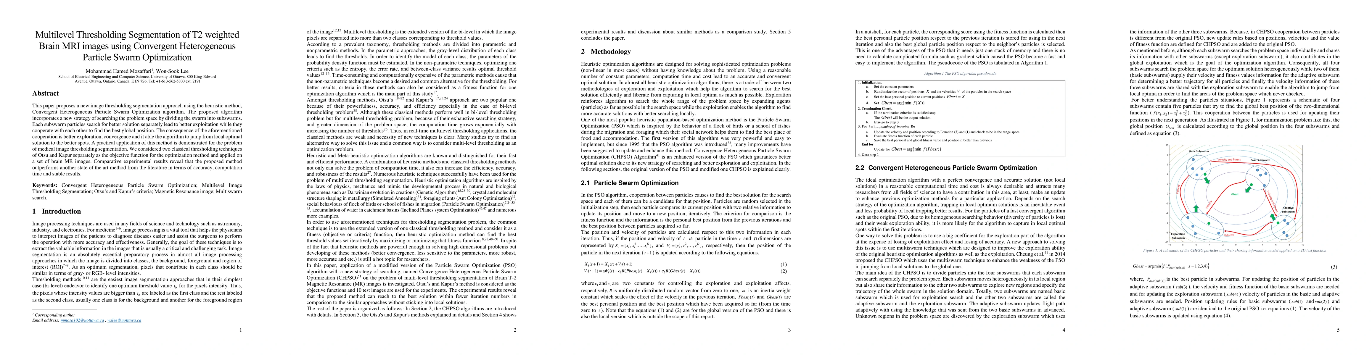 This paper introduces a novel segmentation method for T2 weighted brain MRI images using Convergent Heterogeneous Particle Swarm Optimization, which divides the swarm into subswarms for better exploitation and cooperation, leading to improved accuracy and faster computation compared to existing techniques. Experimental results show superior performance over state-of-the-art methods.