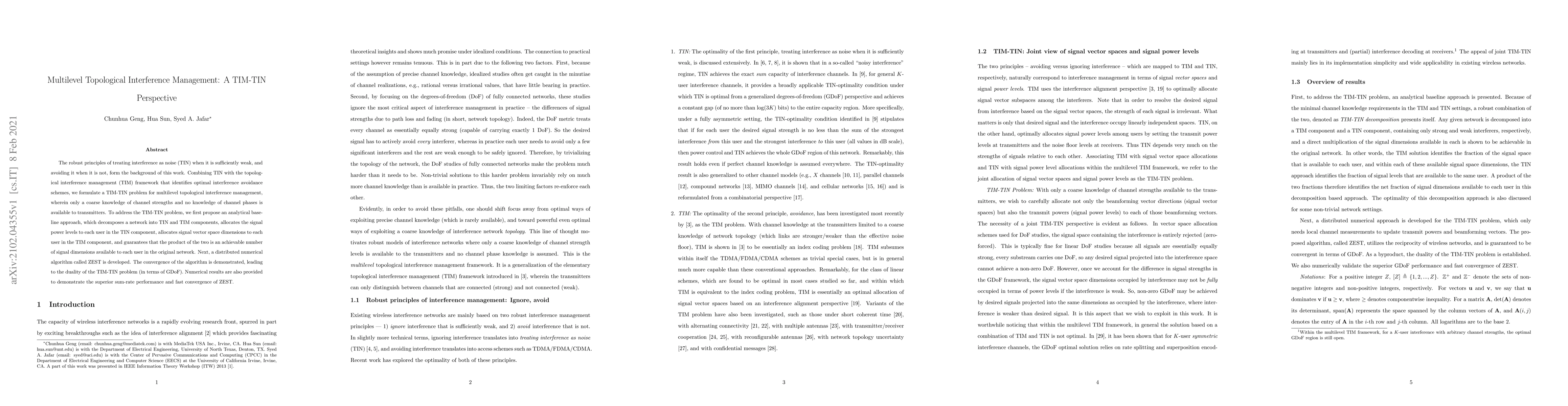 This paper proposes a multilevel topological interference management (TIM-TIN) framework that combines treating interference as noise (TIN) with optimal interference avoidance schemes. It introduces an analytical baseline approach and a distributed numerical algorithm, ZEST, to achieve superior sum-rate performance and fast convergence under limited channel knowledge.