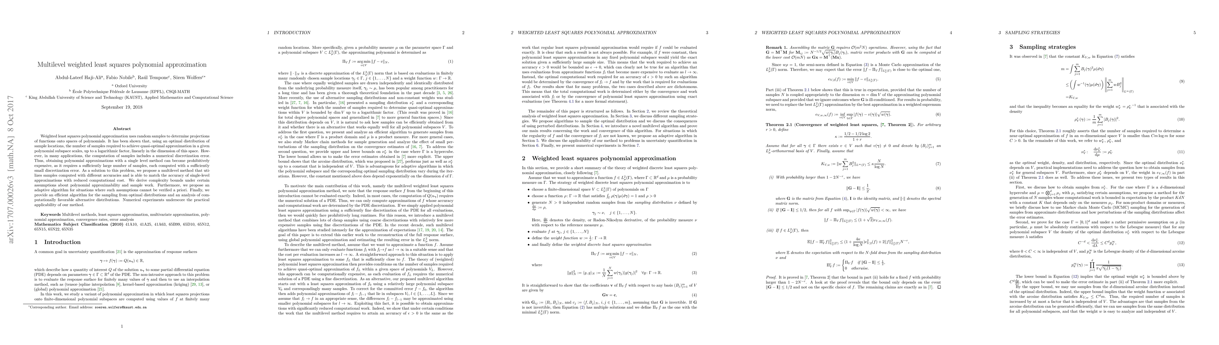 This paper proposes a multilevel weighted least squares polynomial approximation method to reduce computational costs by using samples with varying accuracies. It provides complexity bounds and an adaptive algorithm, and demonstrates practical applicability through numerical experiments.