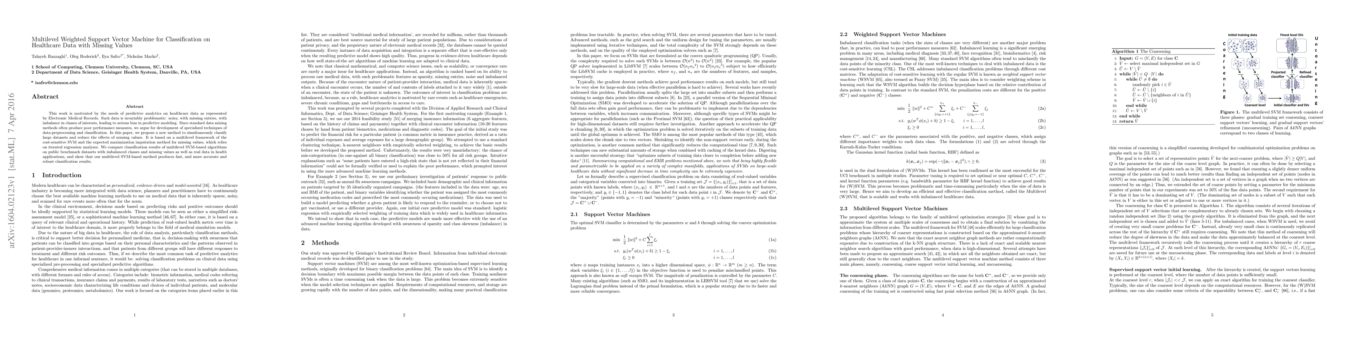 This paper proposes a multilevel weighted support vector machine (SVM) method to classify healthcare data with missing values, addressing issues of noise, class imbalance, and missing entries. The method combines cost-sensitive SVM with expected maximization imputation for missing values, demonstrating superior performance on benchmark and real-world healthcare datasets.