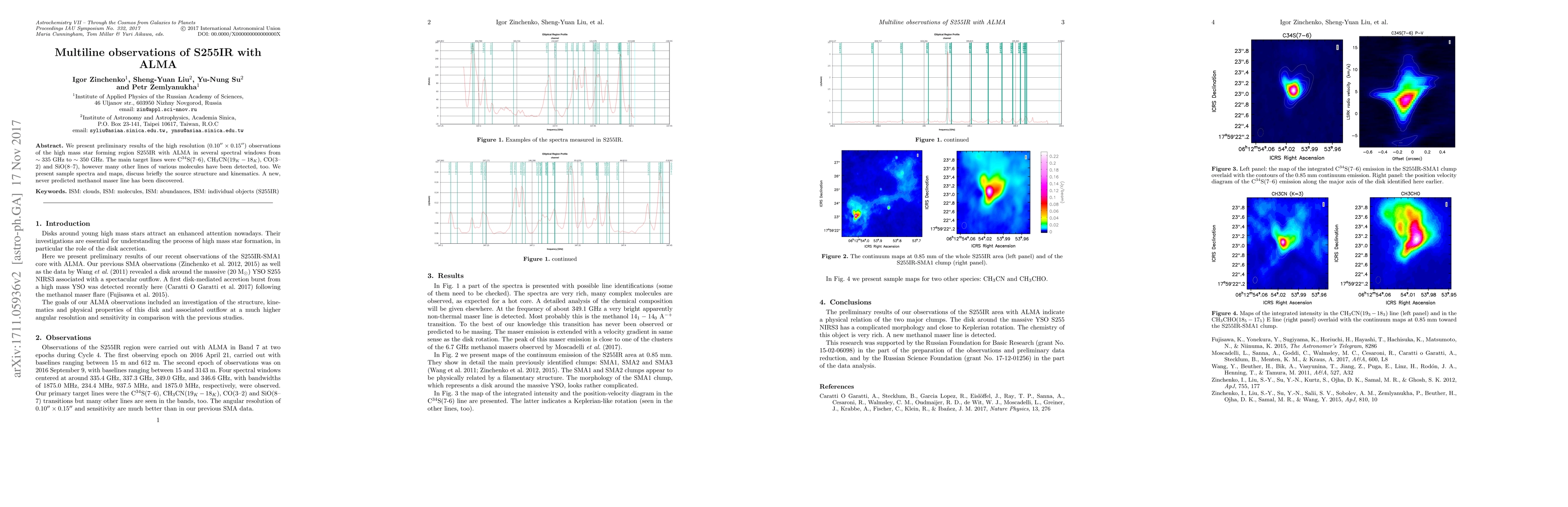We present preliminary results of the high resolution $ (0.10^{\prime\prime} \times 0.15^{\prime\prime}) $ observations of the high mass star forming region S255IR with ALMA in several spectral windows from ~ 335 GHz to ~ 350 GHz. The main target lines were C$^{34}$S(7-6), CH$_3$CN($19_K-18_K$), CO(3-2) and SiO(8-7), however many other lines of various molecules have been detected, too. We present sample spectra and maps, discuss briefly the source structure and kinematics. A new, never predicted methanol maser line has been discovered.
