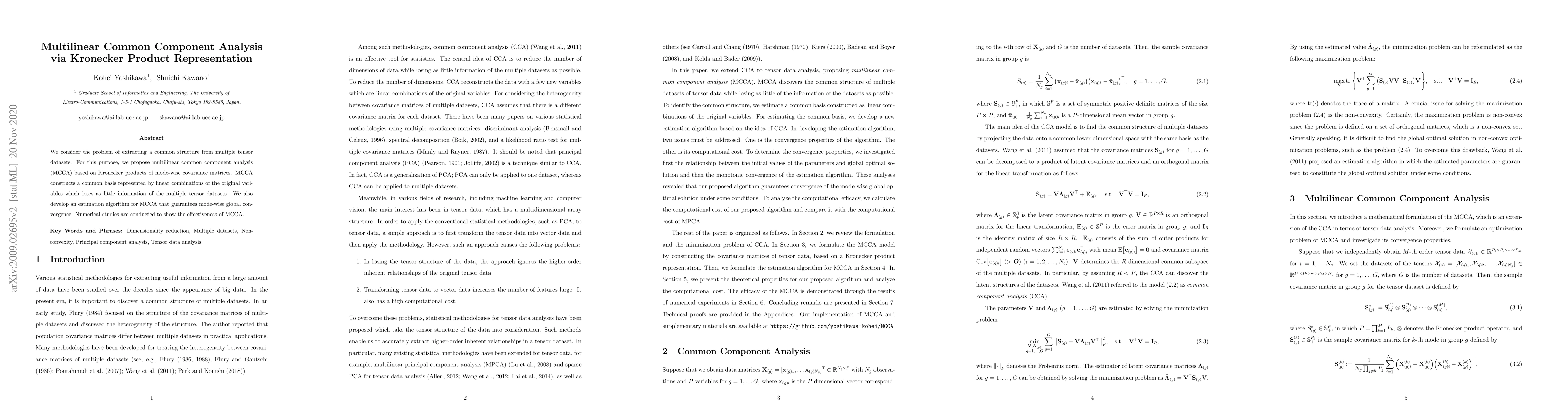 We consider the problem of extracting a common structure from multiple tensor datasets. For this purpose, we propose multilinear common component analysis (MCCA) based on Kronecker products of mode-wise covariance matrices. MCCA constructs a common basis represented by linear combinations of the original variables which loses as little information of the multiple tensor datasets. We also develop an estimation algorithm for MCCA that guarantees mode-wise global convergence. Numerical studies are conducted to show the effectiveness of MCCA.