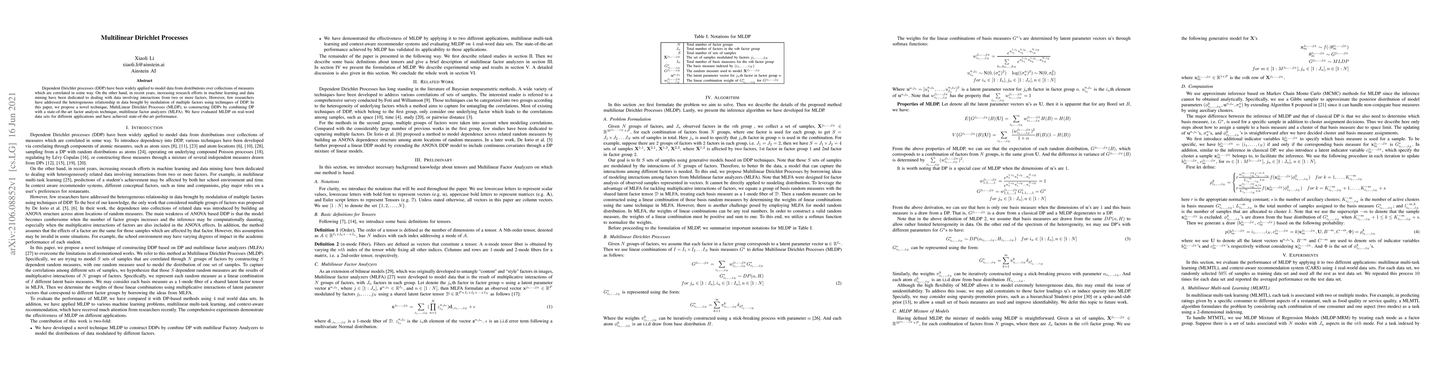 Dependent Dirichlet processes (DDP) have been widely applied to model data from distributions over collections of measures which are correlated in some way. On the other hand, in recent years, increasing research efforts in machine learning and data mining have been dedicated to dealing with data involving interactions from two or more factors. However, few researchers have addressed the heterogeneous relationship in data brought by modulation of multiple factors using techniques of DDP. In this paper, we propose a novel technique, MultiLinear Dirichlet Processes (MLDP), to constructing DDPs by combining DP with a state-of-the-art factor analysis technique, multilinear factor analyzers (MLFA). We have evaluated MLDP on real-word data sets for different applications and have achieved state-of-the-art performance.