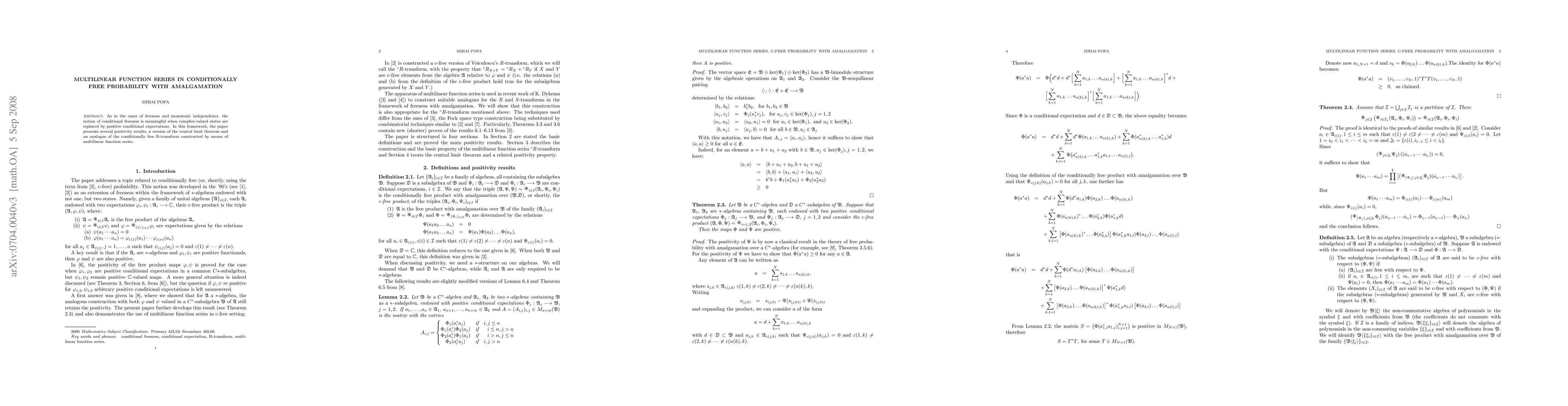 This paper explores conditional freeness in the context of multilinear function series, presenting positivity results, a central limit theorem analogue, and a conditionally free R-transform, all constructed through multilinear function series.