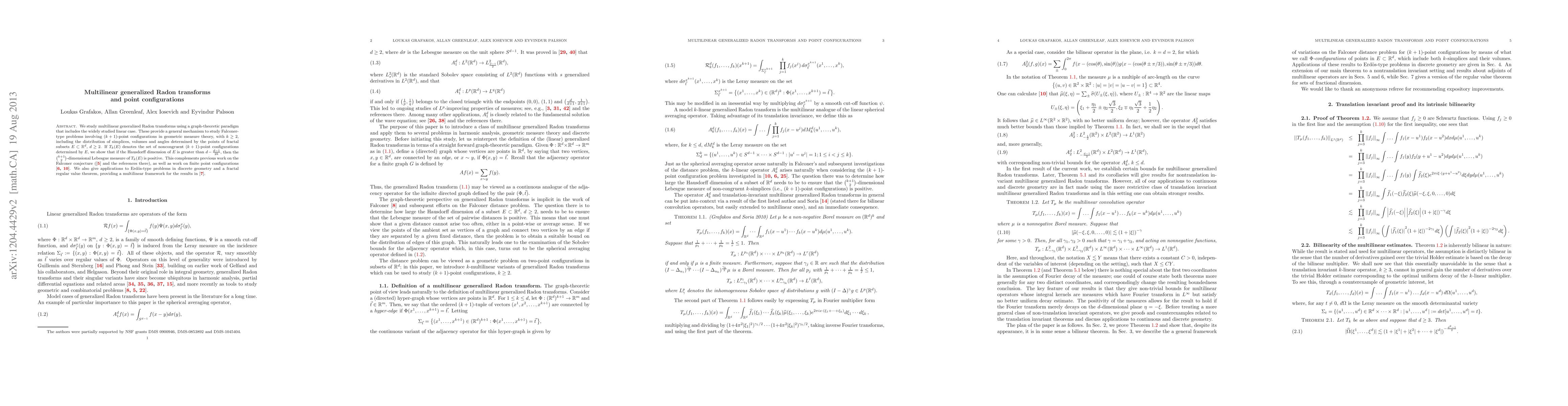 We study multilinear generalized Radon transforms using a graph-theoretic paradigm that includes the widely studied linear case. These provide a general mechanism to study Falconer-type problems involving $(k+1)$-point configurations in geometric measure theory, with $k \ge 2$, including the distribution of simplices, volumes and angles determined by the points of fractal subsets $E \subset {\Bbb R}^d$, $d \ge 2$. If $T_k(E)$ denotes the set of noncongruent $(k+1)$-point configurations determined by $E$, we show that if the Hausdorff dimension of $E$ is greater than $d-\frac{d-1}{2k}$, then the ${k+1 \choose 2}$-dimensional Lebesgue measure of $T_k(E)$ is positive. This compliments previous work on the Falconer conjecture (\cite{Erd05} and the references there), as well as work on finite point configurations \cite{EHI11,GI10}. We also give applications to Erd\"os-type problems in discrete geometry and a fractal regular value theorem, providing a multilinear framework for the results in \cite{EIT11}.