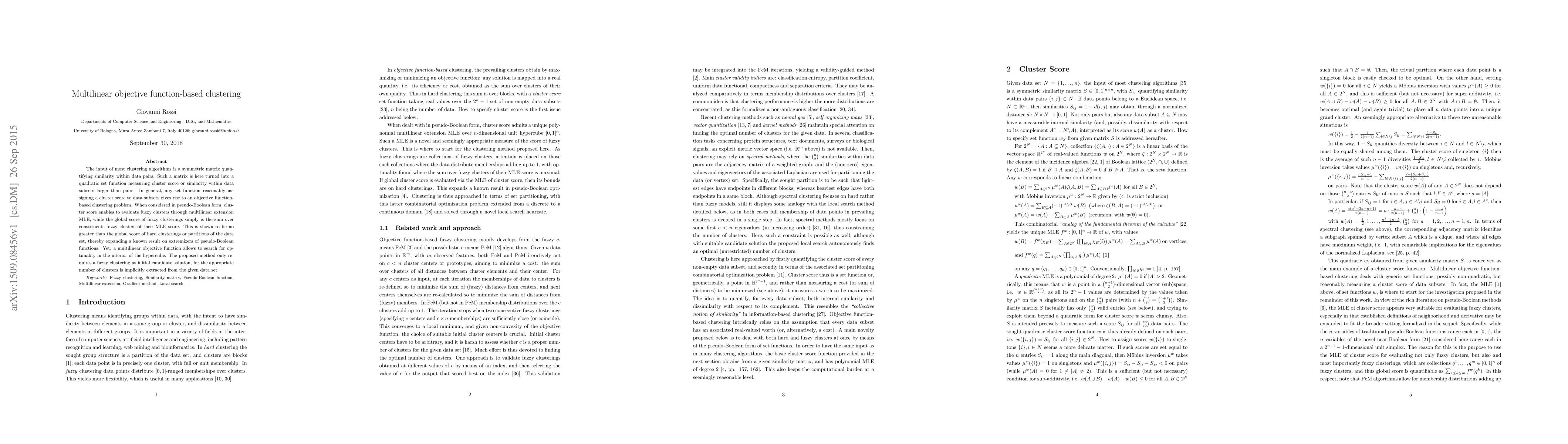 The input of most clustering algorithms is a symmetric matrix quantifying similarity within data pairs. Such a matrix is here turned into a quadratic set function measuring cluster score or similarity within data subsets larger than pairs. In general, any set function reasonably assigning a cluster score to data subsets gives rise to an objective function-based clustering problem. When considered in pseudo-Boolean form, cluster score enables to evaluate fuzzy clusters through multilinear extension MLE, while the global score of fuzzy clusterings simply is the sum over constituents fuzzy clusters of their MLE score. This is shown to be no greater than the global score of hard clusterings or partitions of the data set, thereby expanding a known result on extremizers of pseudo-Boolean functions. Yet, a multilinear objective function allows to search for optimality in the interior of the hypercube. The proposed method only requires a fuzzy clustering as initial candidate solution, for the appropriate number of clusters is implicitly extracted from the given data set.