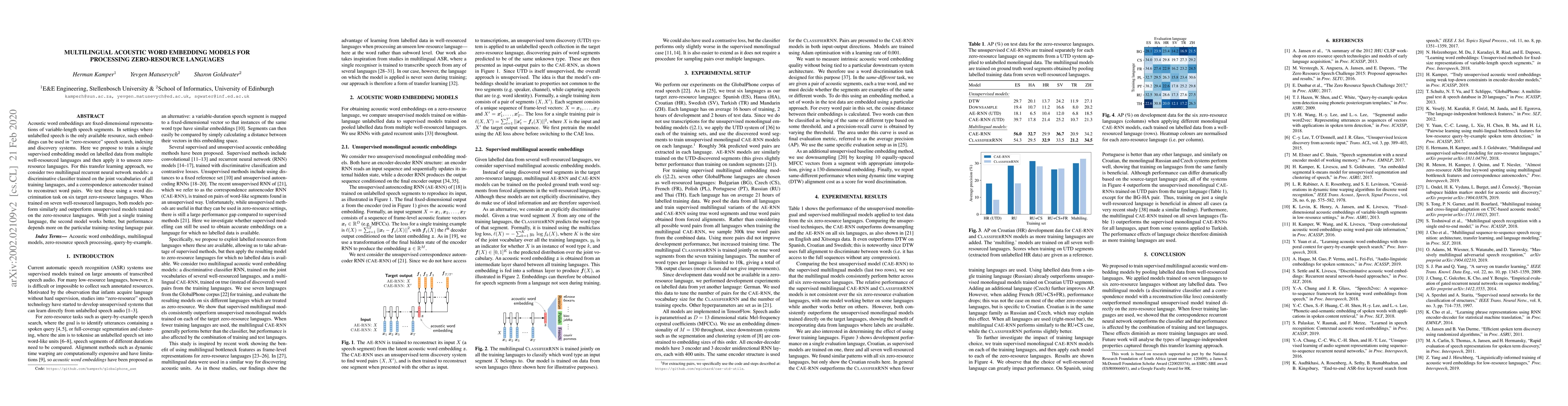 This research proposes supervised multilingual acoustic word embeddings trained on labelled data from multiple well-resourced languages for use in zero-resource languages. It tests two recurrent neural network models: a discriminative classifier and a correspondence autoencoder, finding that both perform better than unsupervised models when applied to six zero-resource languages.