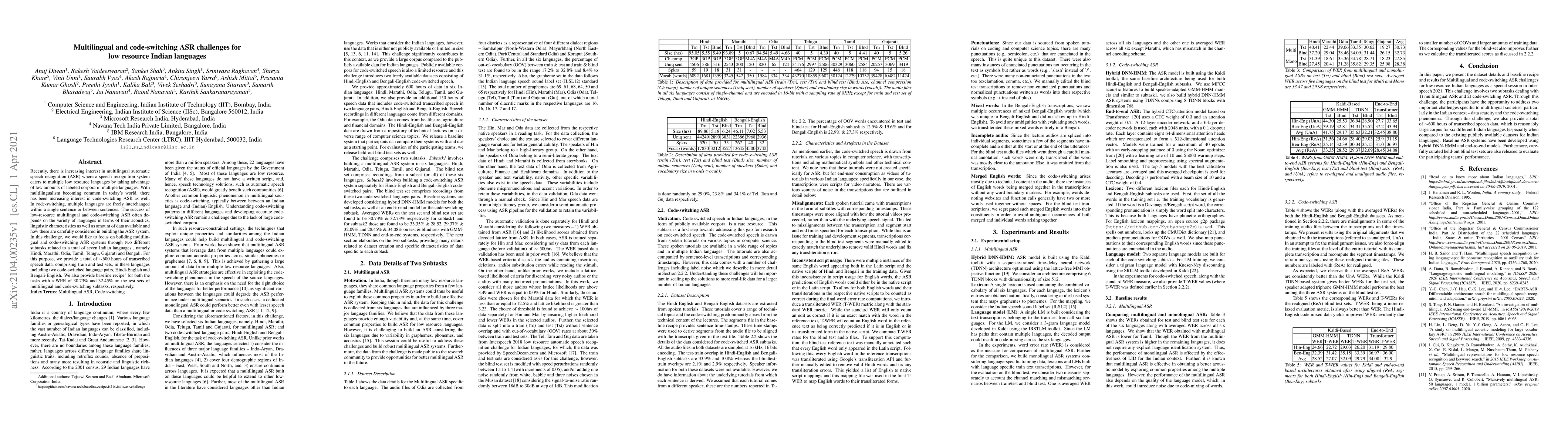 Recently, there is increasing interest in multilingual automatic speech recognition (ASR) where a speech recognition system caters to multiple low resource languages by taking advantage of low amounts of labeled corpora in multiple languages. With multilingualism becoming common in today's world, there has been increasing interest in code-switching ASR as well. In code-switching, multiple languages are freely interchanged within a single sentence or between sentences. The success of low-resource multilingual and code-switching ASR often depends on the variety of languages in terms of their acoustics, linguistic characteristics as well as the amount of data available and how these are carefully considered in building the ASR system. In this challenge, we would like to focus on building multilingual and code-switching ASR systems through two different subtasks related to a total of seven Indian languages, namely Hindi, Marathi, Odia, Tamil, Telugu, Gujarati and Bengali. For this purpose, we provide a total of ~600 hours of transcribed speech data, comprising train and test sets, in these languages including two code-switched language pairs, Hindi-English and Bengali-English. We also provide a baseline recipe for both the tasks with a WER of 30.73% and 32.45% on the test sets of multilingual and code-switching subtasks, respectively.