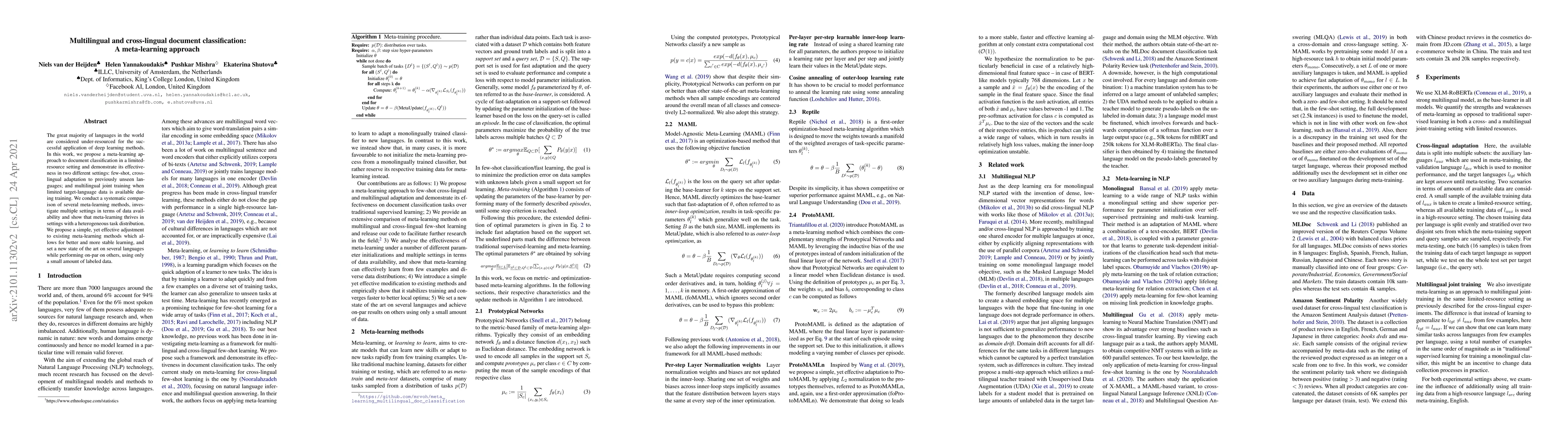 This paper proposes a meta-learning approach for multilingual document classification in under-resourced languages, demonstrating effectiveness in few-shot and cross-lingual adaptation scenarios. It introduces an adjustment to existing meta-learning methods, achieving state-of-the-art results on several languages with limited labeled data.