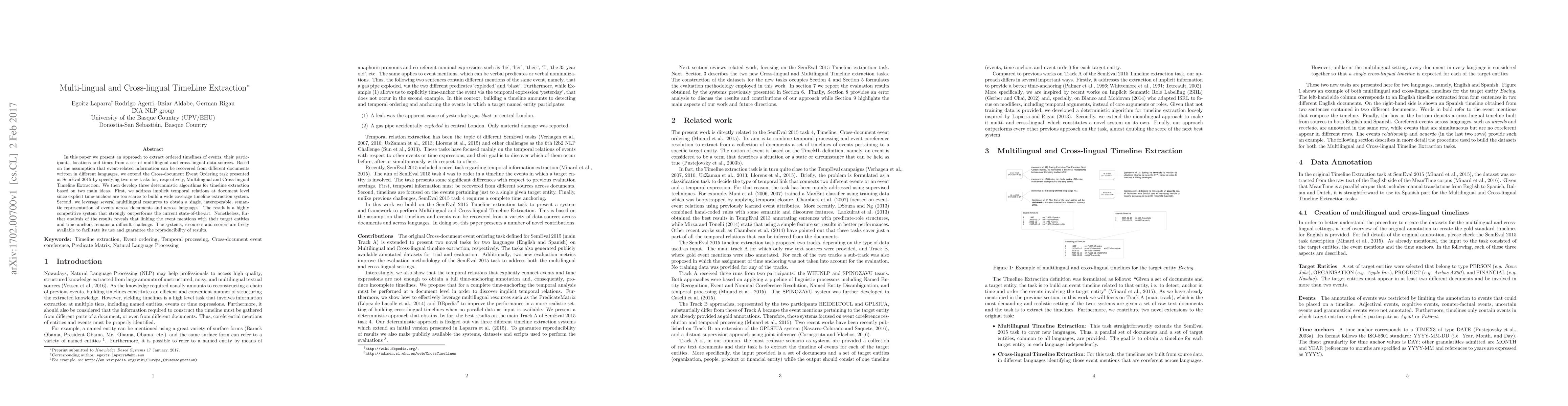 This paper introduces algorithms for extracting ordered timelines of events from multilingual and cross-lingual data, leveraging implicit temporal relations and multilingual resources for a unified semantic representation. Despite outperforming current state-of-the-art, challenges remain in linking event mentions to entities and time-anchors.