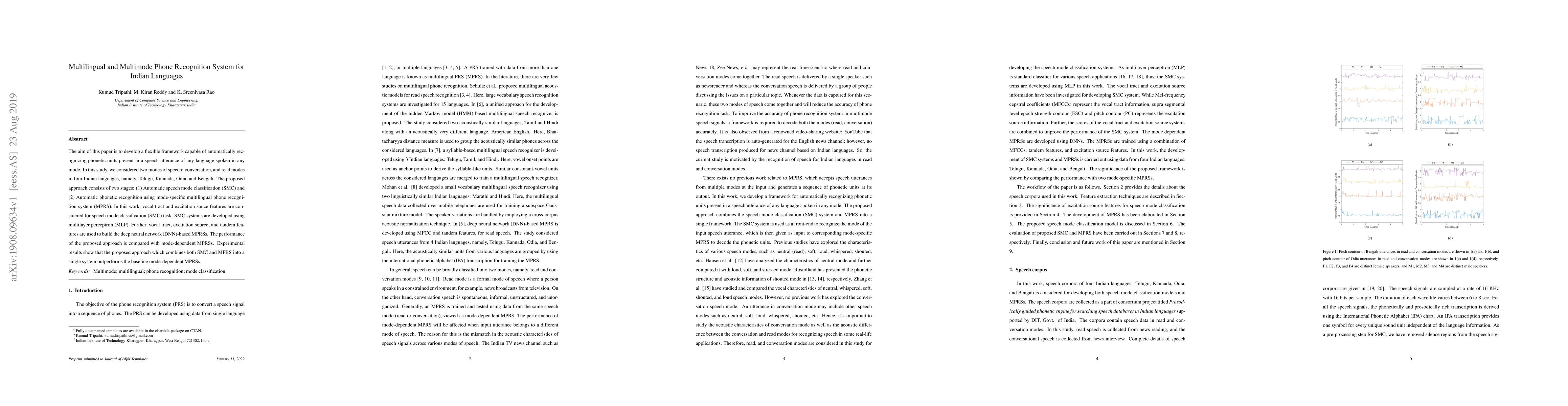 A phone recognition system for Indian languages has been developed to recognize phonetic units in speech utterances of various modes, including conversation and read modes. The system outperforms traditional mode-dependent approaches with a combined system that uses automatic speech mode classification and multilingual phonetic recognition.