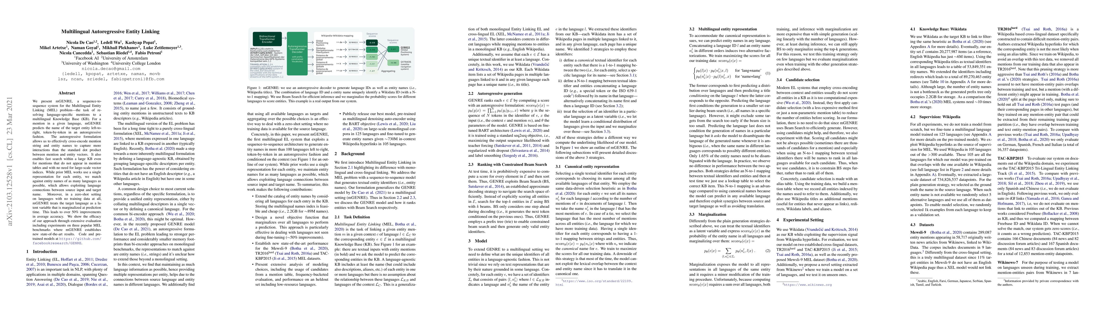 The paper introduces mGENRE, a sequence-to-sequence system for Multilingual Entity Linking, achieving state-of-the-art results by resolving language-specific mentions to a multilingual Knowledge Base through autoregressive prediction and cross-encoding. It demonstrates over 50% accuracy improvements in zero-shot settings and outperforms existing methods on popular benchmarks.