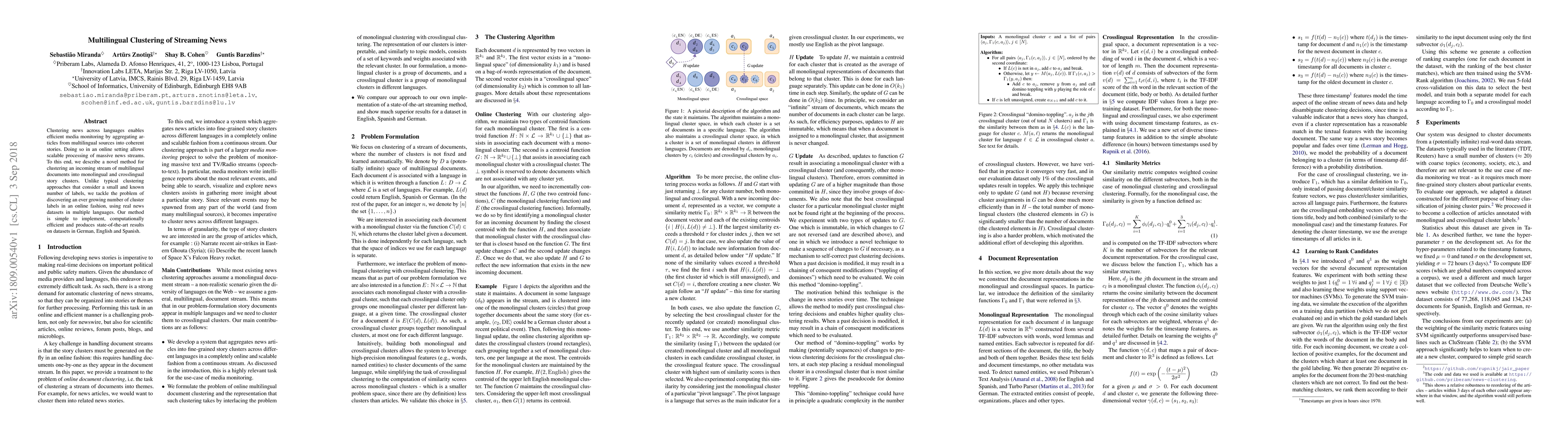 This paper introduces a novel method for clustering multilingual streaming news into monolingual and crosslingual story clusters in real-time, addressing the challenge of an ever-expanding number of cluster labels. The approach is computationally efficient and achieves state-of-the-art results on news datasets in German, English, and Spanish.